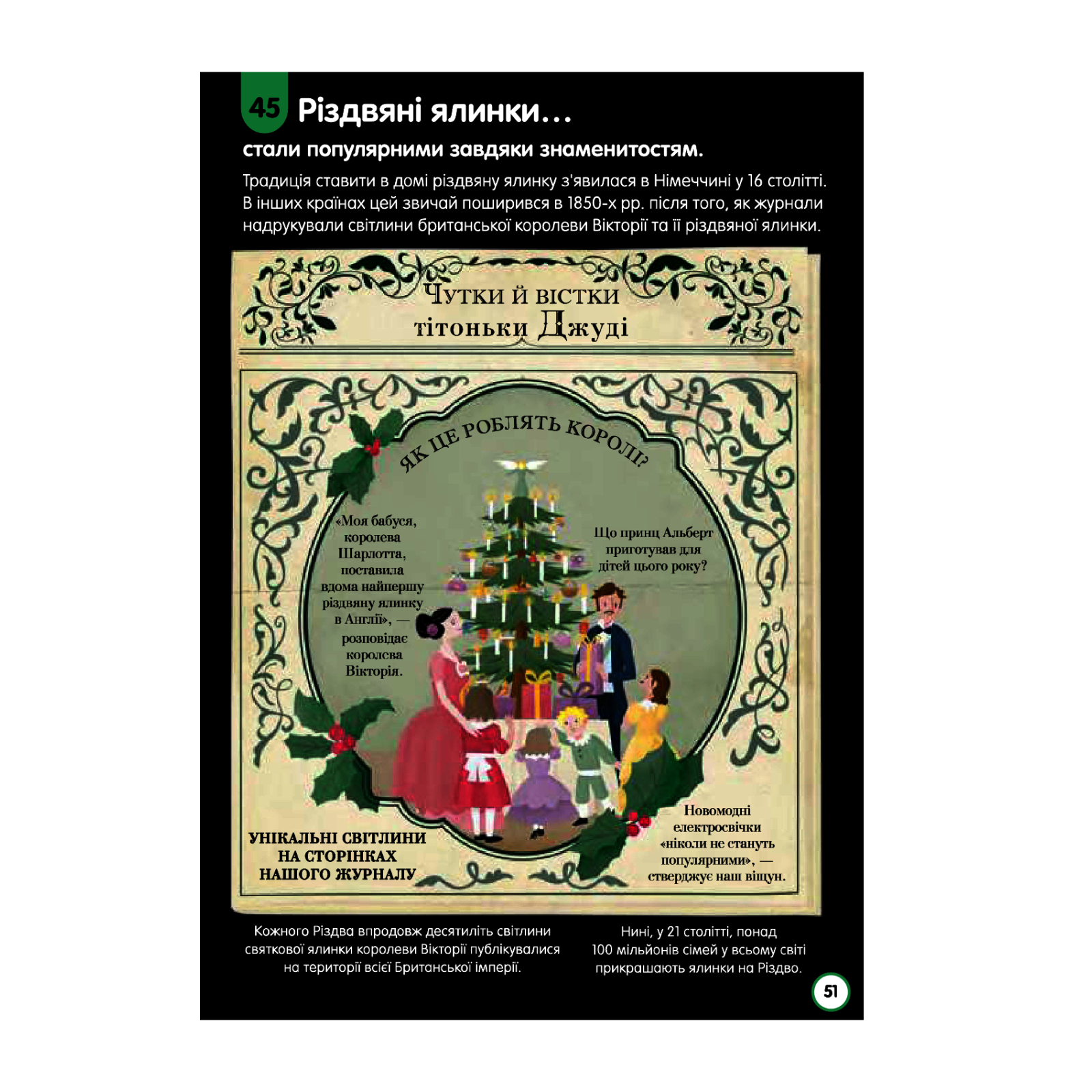 У книжці йдеться про минуле нашого людства, розмаїття трагічного і величного, смішного і повчального. Історія постане перед тобою у сильних постатях, кумедних випадках, сміливих вчинках, цікавих закономірностях. Дивовижна інформація з цього видання не просто збагатить твої знання, але й допоможе зрозуміти сьогодення. Чому цибулини тюльпанів коштували більше, ніж маєтки? За що голубка отримала військову нагороду? Скільки років потрібно було для виготовлення книжки? Відповіді на ці та інші питання ви знайдете в середині книжки.