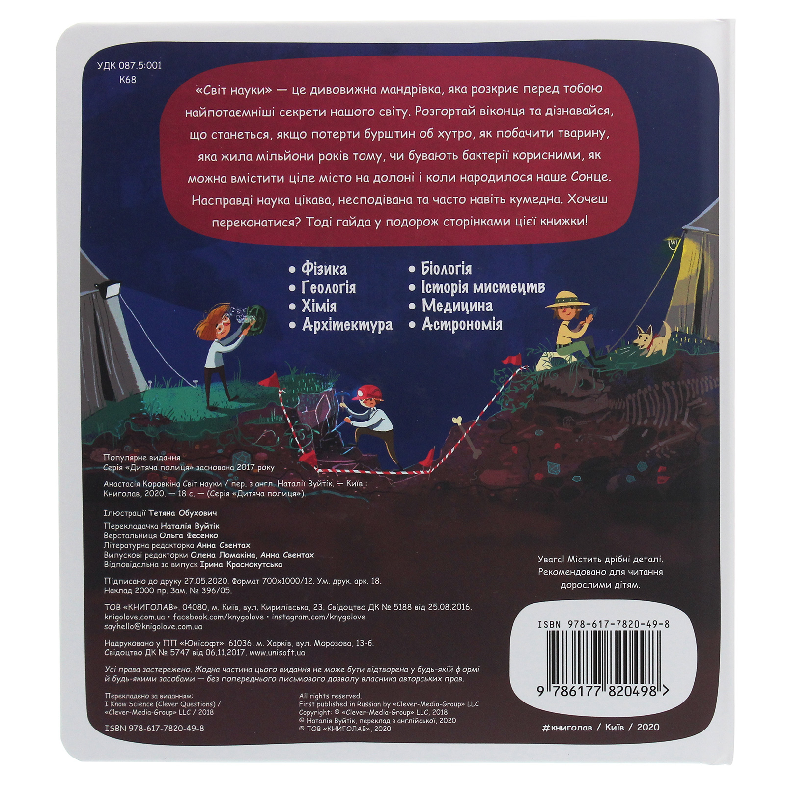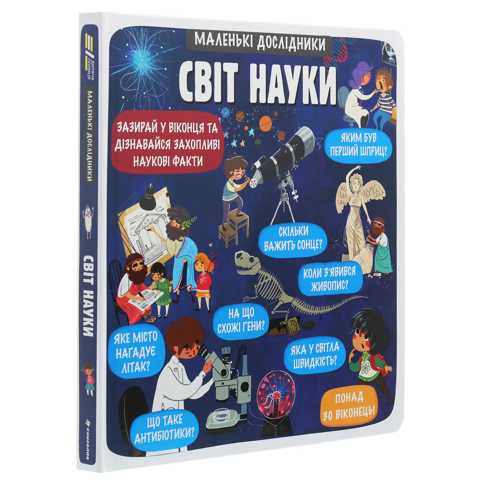 У книжці «Світ науки» юні читачі зможуть знайти цікаві факти про природні явища та технології, винаходи та дослідження. Що станеться, якщо потерти бурштин об хутро? Як побачити тварину, яка жила мільйони років тому? Чи бувають бактерії корисними? Як можна вмістити ціле місто на долоні, і коли народилося наше Сонце? Відповіді на ці запитання читачі знайдуть на сторінках цієї книжки.