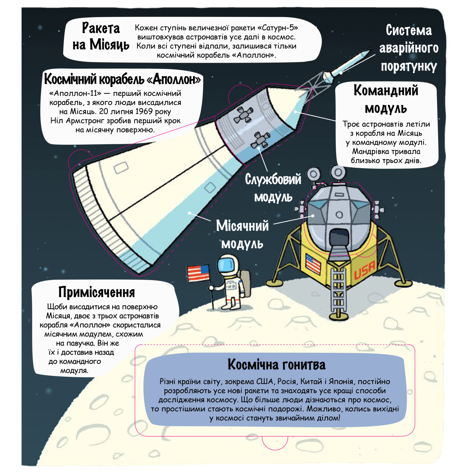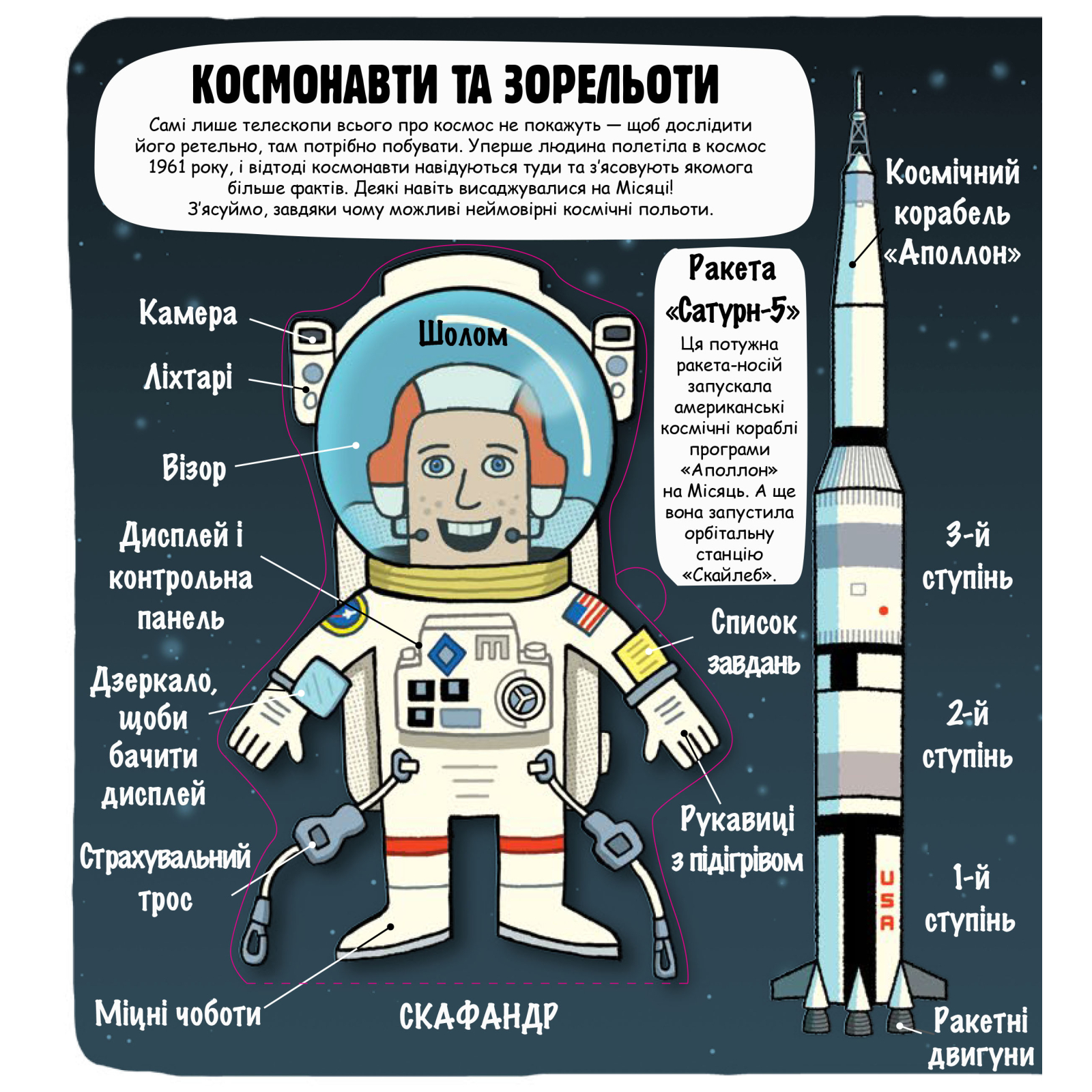 • Довідайся про дивовижні позаземні мандрівки: від польотів на Місяць до стрімкого руху зондів у космічну далечінь.