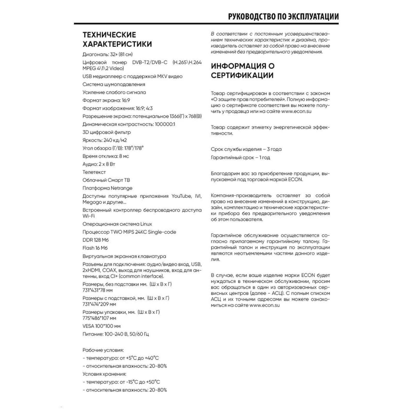 Телевизор Econ LED EX-32HS019B, 32", 1366x768, HDMI, USB, Smart TV, цвет чёрный