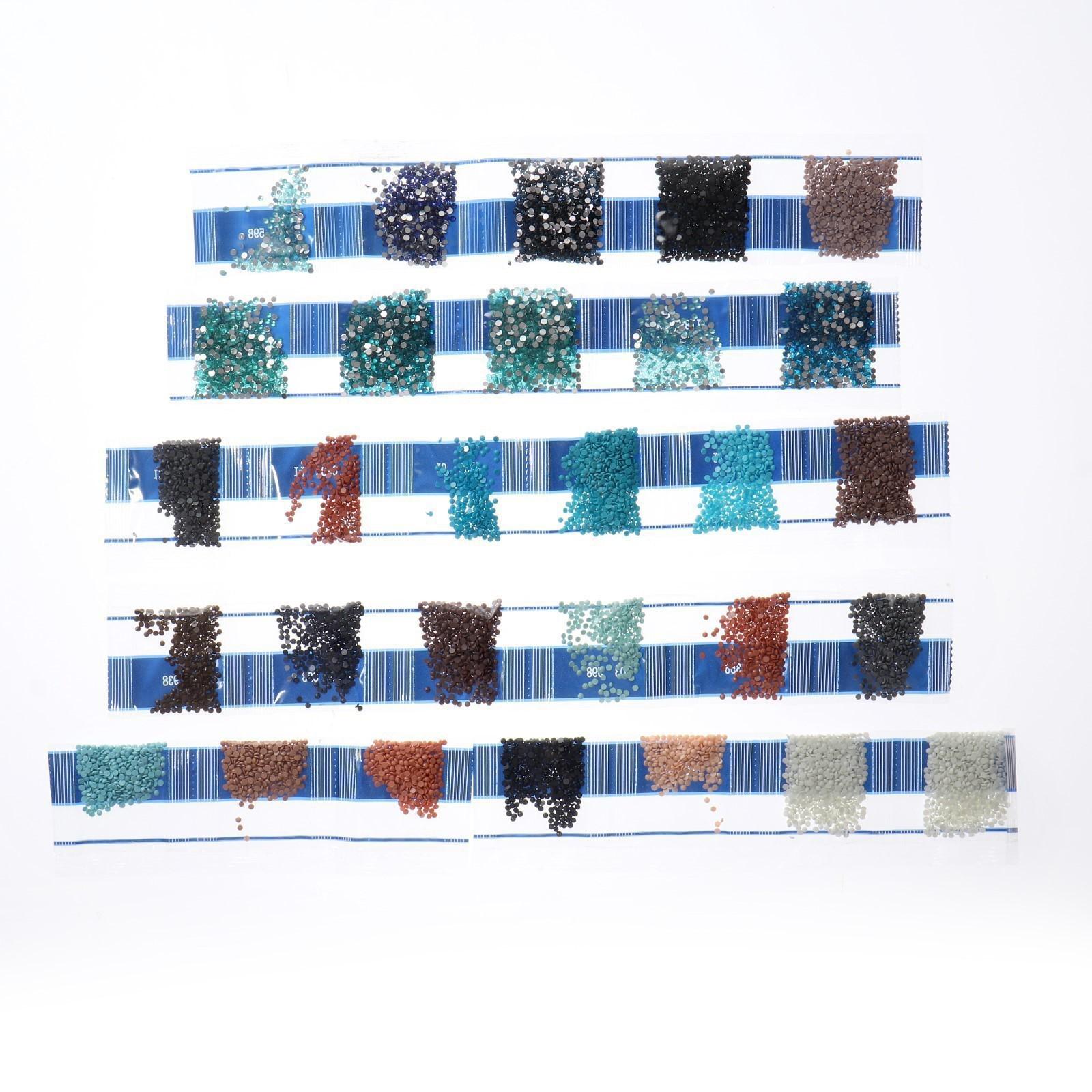 Разложите кристаллики с помощью карандаша по указанной схеме, заполнив полотно. На картине уже обозначены необходимые оттенки. Холст с клеевым покрытием будет надёжно удерживать стразы.