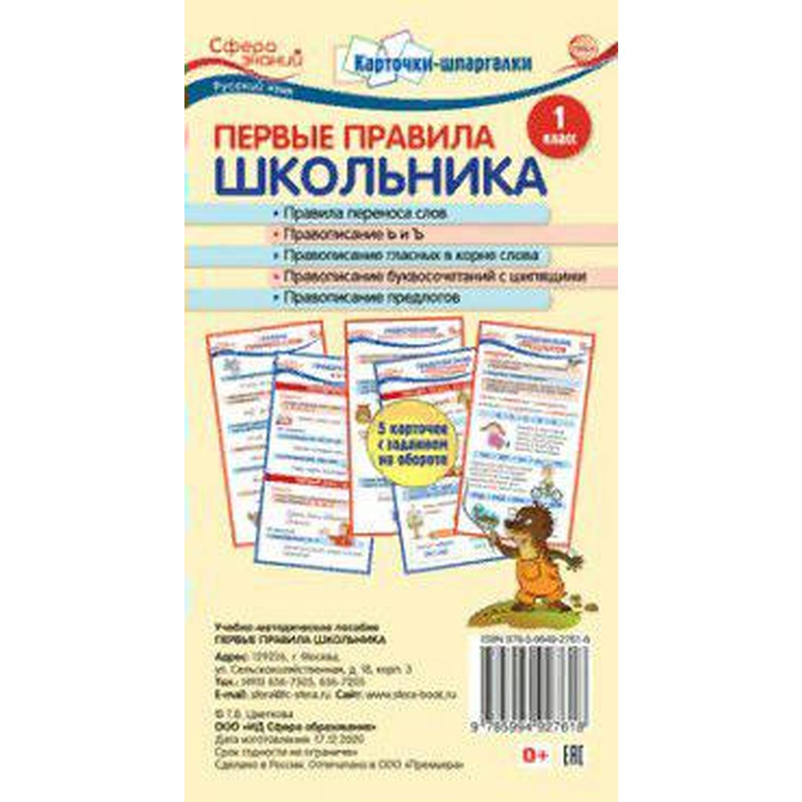 Учебно-методическое пособие «Первые правила школьника» представляет собой набор из пяти цветных карточек-шпаргалок по русскому языку для 1-го класса с заданиями и упражнениями.