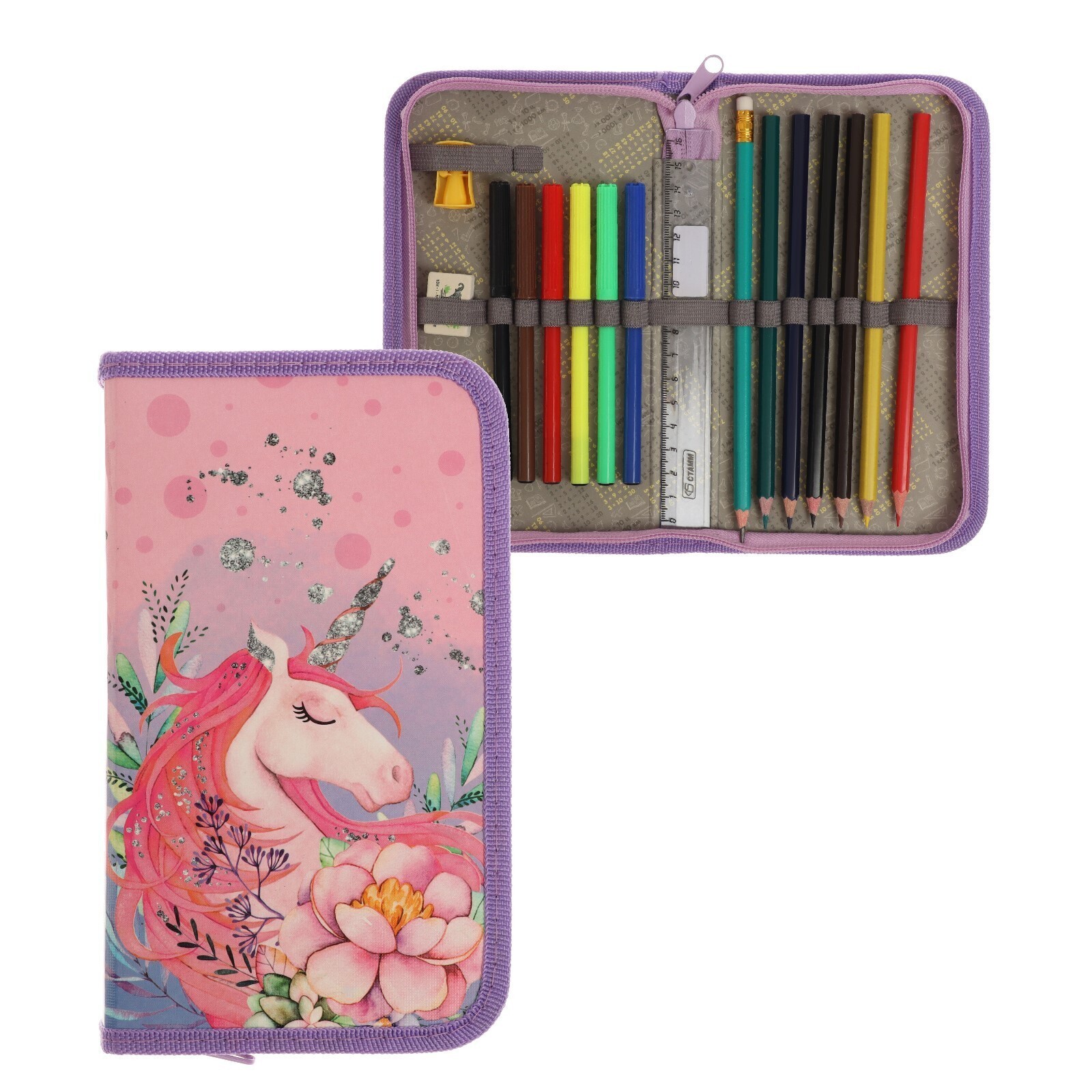 Пенал 1 секция, 115 х 205 х 30 мм, с наполнением, 16 предметов, Calligrata "Единорог", ламинированный картон