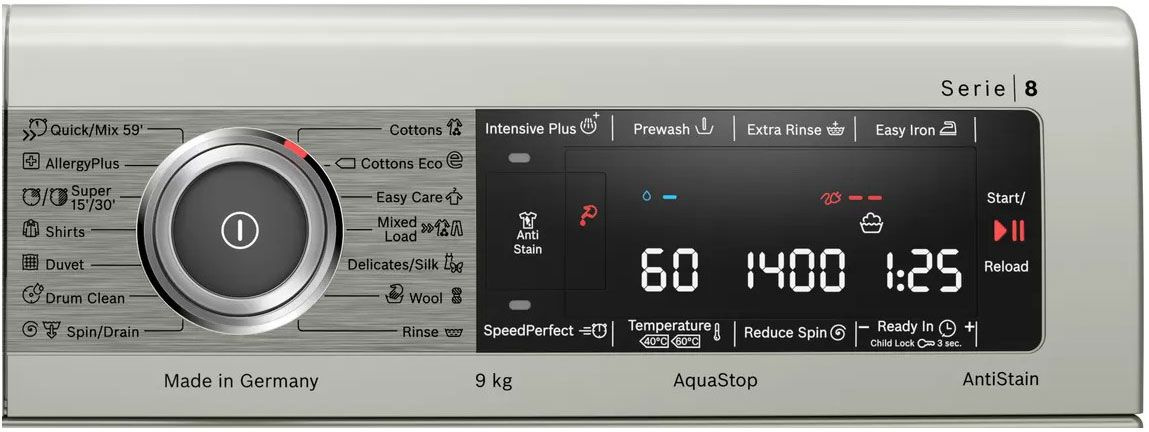 РежимыДополнительное полоскание, выбор скорости отжима, предварительная стирка, интенсивная стирка, выбор температуры стирки, отсрочка старта, старт/пауза, легкая глажка, пятна, блокировка управления