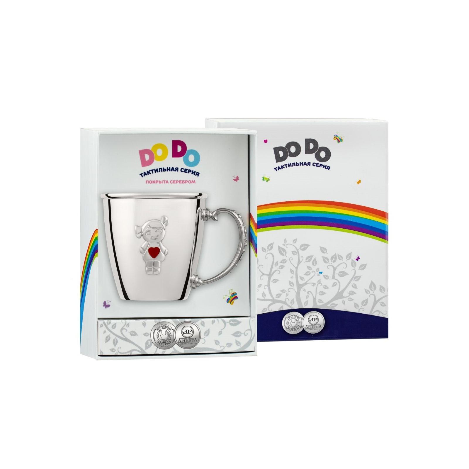 DoDo - новая тактильная серия посеребренных столовых приборов и посуды для детей. Каждый предмет коллекции создан с учетом особенностей развития ребенка с самого раннего возраста и является важным и полезным инструментом для родителей. Основной принцип - это специальный рельеф, который через тактильное восприятие способствует общему развитию малыша, в том числе развивает мышление и речь. Посуда с покрытием серебром толщиной 30 микрон является прекрасной альтернативой столовому серебру, обладает антибактериальными и обеззараживающими свойствами, не вызывает аллергических реакций, улучшает работу иммунной системы. Размеры изделий: Кружка - 75,0 г , длина -6,0 см, диаметр - 6 см. Объем - 140 мл.