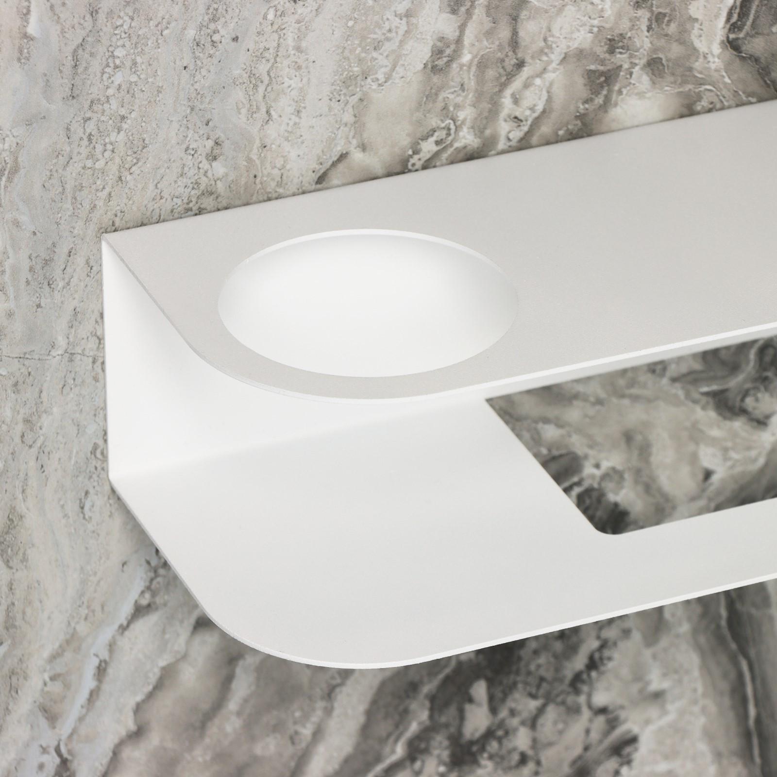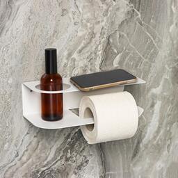 Держатель оснащен дополнительной полочкой, на которую можно положить телефон или ванные принадлежности.