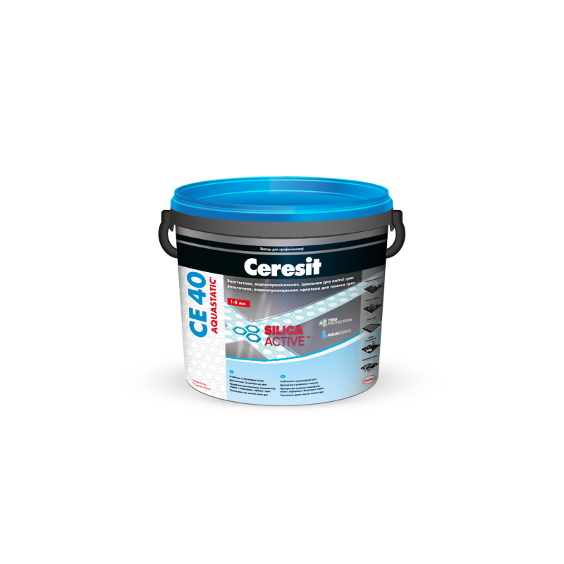 Ceresit СЕ 40 Aquastatic. Эластичная фугаВодостойкая эластичная фуга для заполнения швов шириной до 8 ммСвойства• водостойкая, эластичная, стойкая к загрязнениям;• стабильный и равномерный цвет;• устойчива к трещинам и царапинам;• стойкая к плесени и грибкам;• подходит для влажных помещений, полов с подогревом, балконов и террас;• для внутренних и наружных работ.Область примененияЭластичная водостойкая фуга Ceresit CE 40 с технологией Silica Active предназначена для расшивки швов внутри и снаружи помещений на вертикальных и горизонтальных поверхностях между керамическими плитками, керамогранитом (грес), мозаикой, плиткой из стекла или натурального камня, в том числе мрамора, не чувствительного к изменению цвета. Фуга позволяет формировать швы с равномерной гладкой структурой толщиной от 1 до 8 мм. Специальная рецептура Ceresit CE 40 включает ряд технологий и формул для длительного срока службы швов:Благодаря своей эластичности, фугу Ceresit CE 40 можно применять на деформируемых и критичных основаниях: балконах, террасах, полах с подогревом, гипсокартонных плитах, плитах ДСП и т.д. Ceresit CE 40 может применяться в жилых и общественных помещениях с высокой интенсивностью пешего движения (домах, отелях, офисах, торговых залах, объектах общественного питания), бассейнах, медицинских учреждениях. Рекомендуется для заполнения межплиточных швов в местах, особенно подверженных периодическому увлажнению, например, в ванных комнатах, душевых и кухнях.ТЕХНИЧЕСКИЕ ХАРАКТЕРИСТИКИОснова: смесь цементов с минеральными наполнителями и полимерными модификаторамиПлотность: около 1100 кг/м3Расход воды: 1,4-1,5 л воды на 5 кг1,45 л воды на 5 кг от +5 до +25 °CТемпература применения: от +5 до +25 °CВремя потребления: до 90 мин.Передвижение по поверхности: через 6 часовПрочность на сжатие: > 20 МПаОриентировочный расход при типовой толщине плиток:размер плиток[мм]ширина шва[мм]расход Ceresit CE40 [кг/м2]25 x 25 х 6 2 1,7100 x 100 х 7 2 0,5150 x 150 х 7 3 0,4100 x 200 х 12 2 0,4300 x 300 х 8 3 0,3300 x 600 х 10 3 0,3600 x 600 х 10 3 0,2ХРАНЕНИЕ И УТИЛИЗАЦИЯХранить на поддонах в сухих прохладных помещениях в неповрежденной оригинальной упаковке. Срок хранения – 24 месяца с даты изготовления. Дата изготовления указана на упаковке. Остаткипродукта подлежат утилизации как бытовой мусор. Пустая полимерная тара подлежит сбору для вторичной переработки. По истечении срока хранения подлежит утилизации как бытовой мусор.
