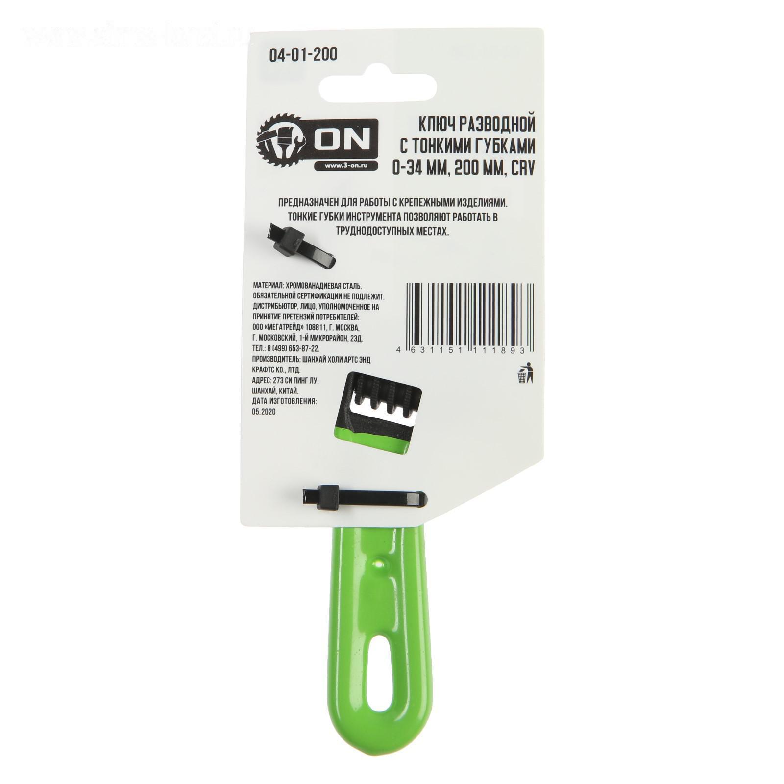 Ключ разводной c тонкими губками ON 04-01-200, укороченная рукоятка 140 мм, 0-34 мм, CrV