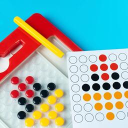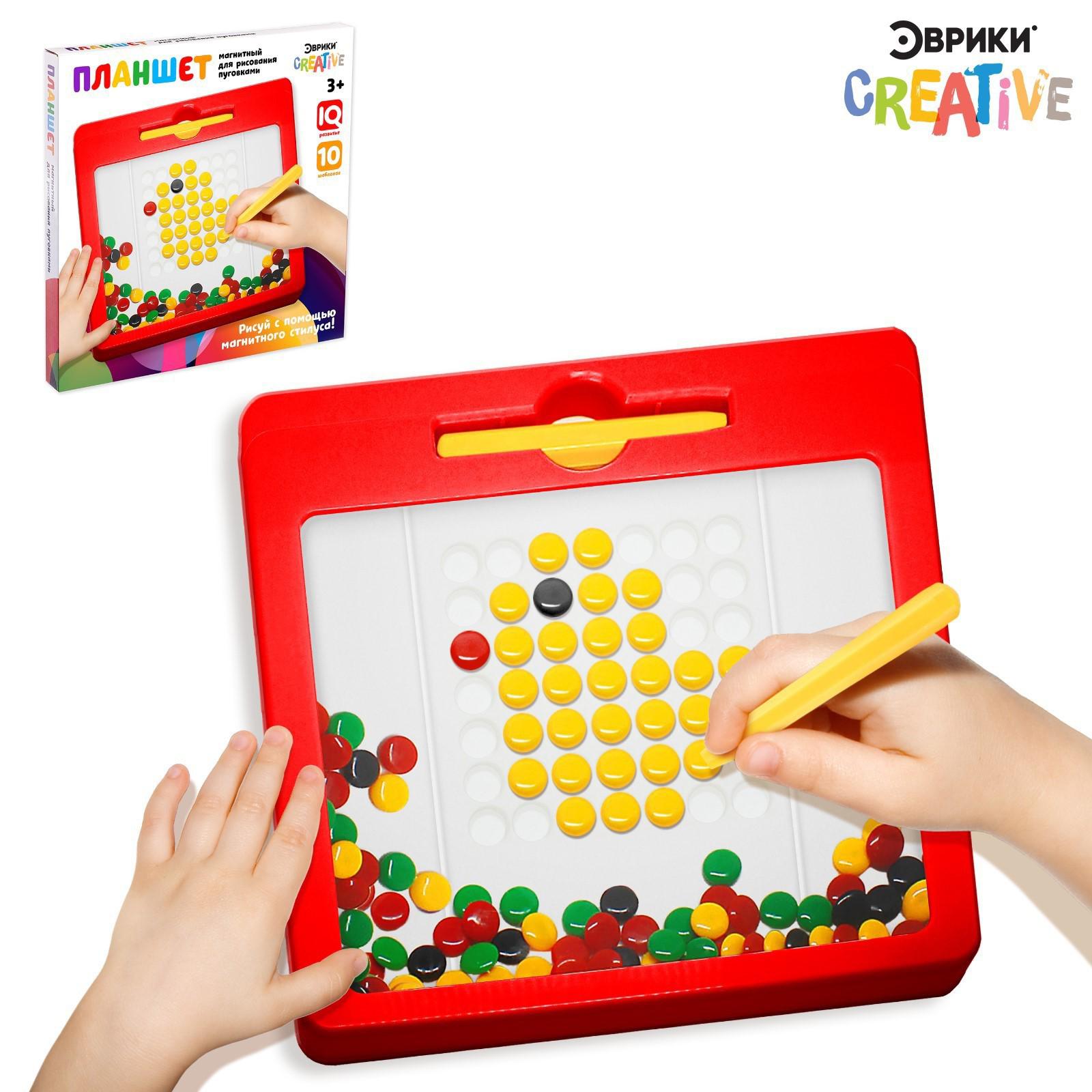 Игра «Магнитное рисование» поможет обучить ребёнка письму в дошкольном возрасте. В комплект входит планшет с разноцветными пуговками и ручка-магнит. Перемещать элементы легко – они сами слушаются палочку с намагниченным наконечником и перелетают в круглые прозрачные ячейки. Малышу не нужно прикасаться к ним руками – чтобы пуговка следовала за стилусом проведите им по понели перемещая в одно из отверстий.