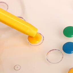 Перемещать элементы легко — они сами слушаются палочку с намагниченным наконечником и перелетают в круглые прозрачные ячейки. Малышу не нужно прикасаться к ним руками, чтобы пуговка следовала за стилусом. Просто проведите им по панели, перемещая в одно из отверстий.