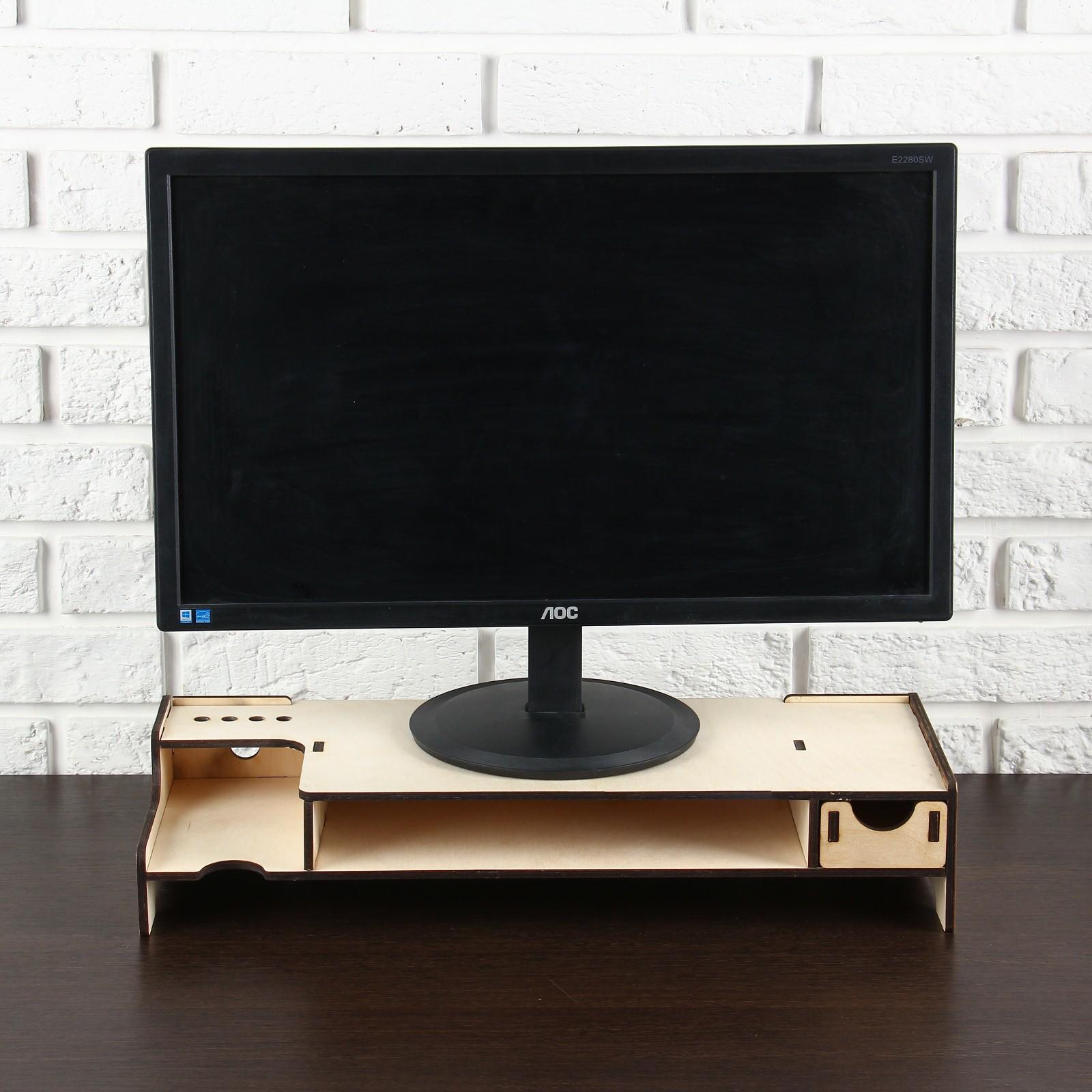 Подставка позволяет удобно расположить монитор на уровне глаз, а небольшие лотки помогут грамотно организовать рабочее пространство, убрав нужные мелочи.