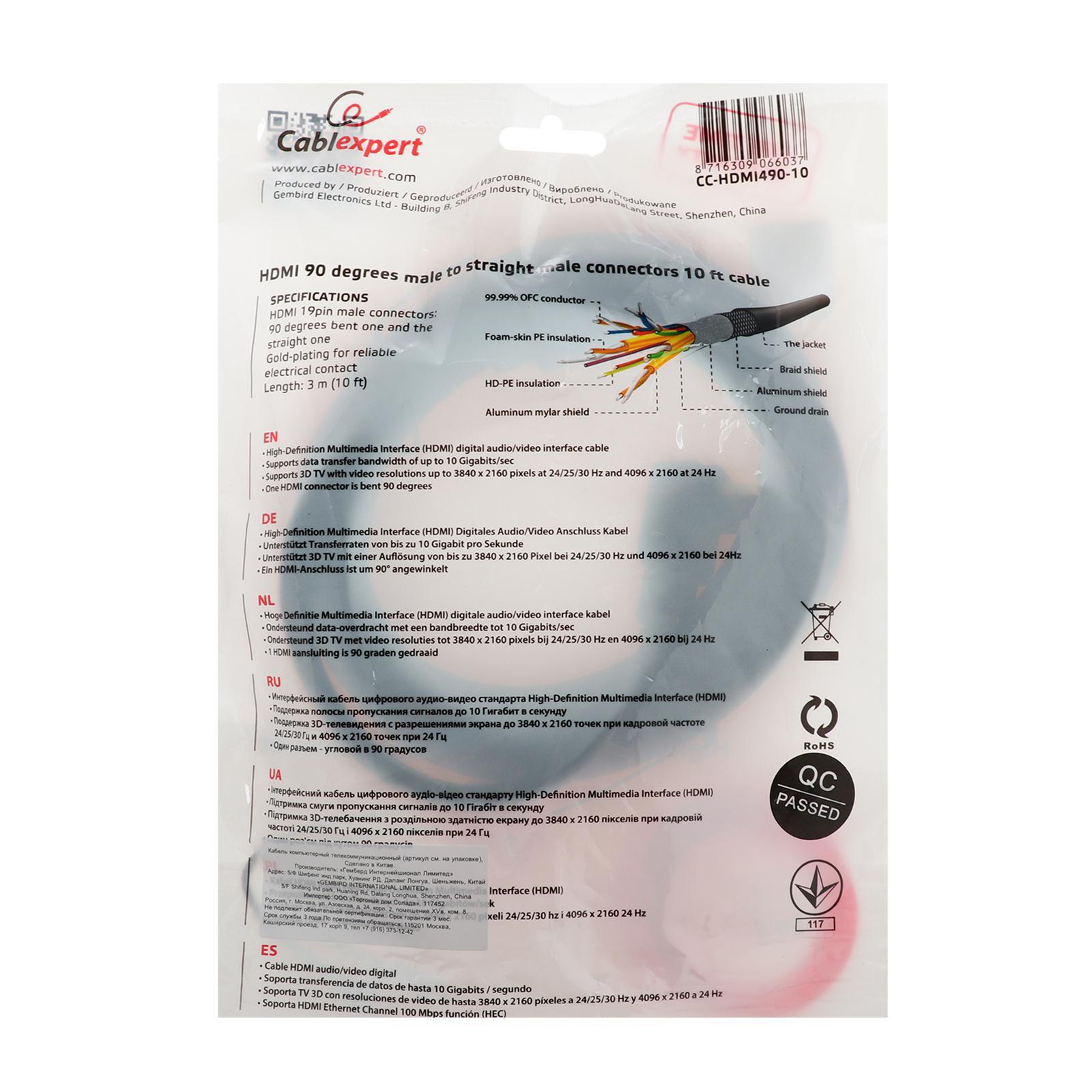 Кабель HDMI Cablexpert, HDMI(m)-HDMI(m), вер.1.4, 3 м, 19M/19M, угловой, черный