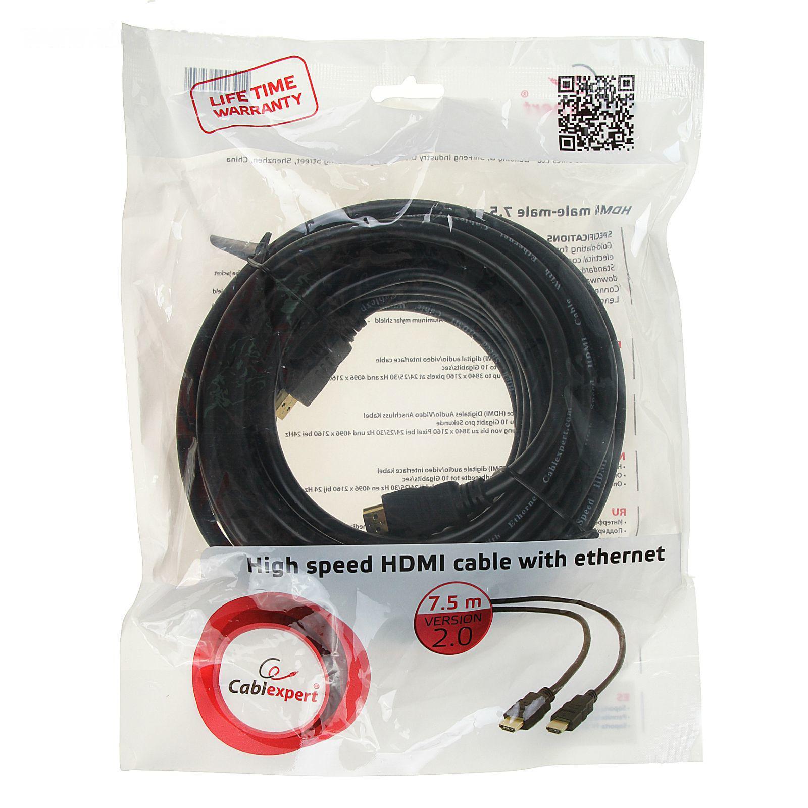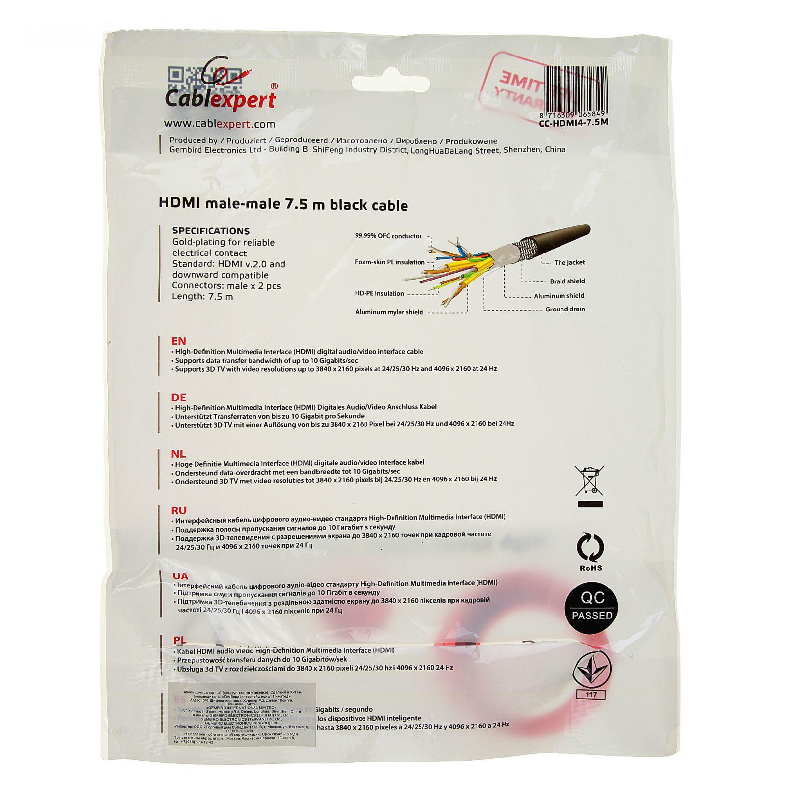 Кабель видео Cablexpert CC-HDMI4-7.5M, HDMI(m)-HDMI(m), вер 2.0, 4К, 7.5 м, черный