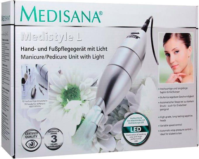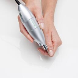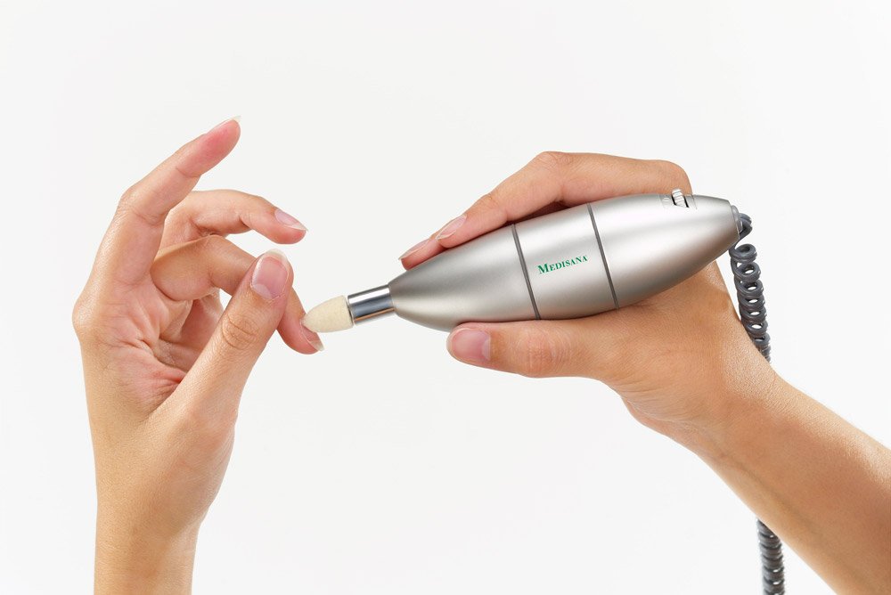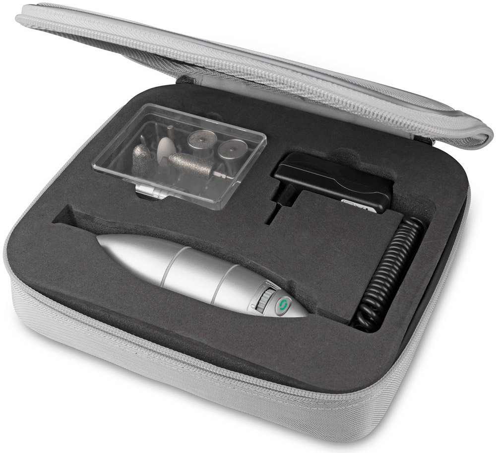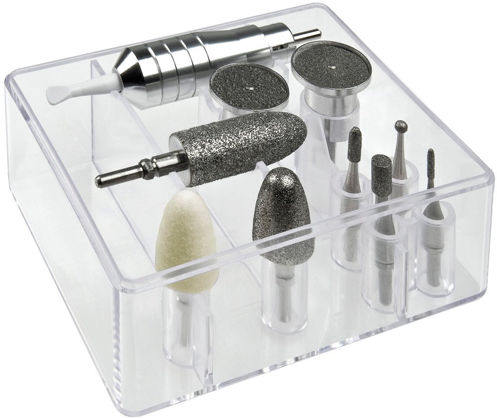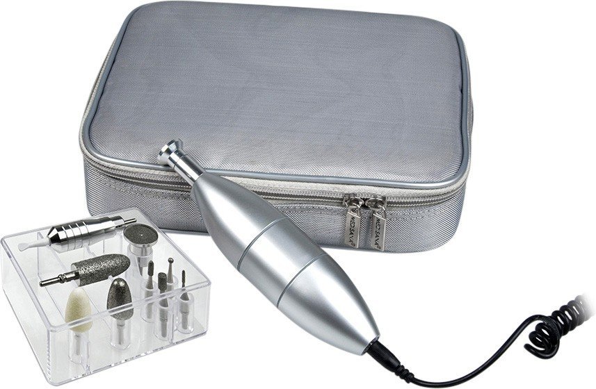 Универсальный набор для маникюра и педикюра. 10 насадок: крупный сапфировый конус, длинный сапфировый конус, факельная фреза, цилиндрическая фреза, круглая сапфировая фреза, фреза для ногтей, крупный сапфировый диск, мелкий сапфировый диск, фетровый конус, лопатка для кутикулы. Плавная регулировка скорости (1600-5000 об/мин).