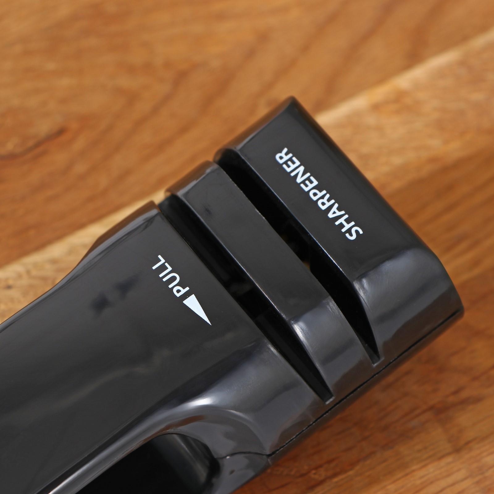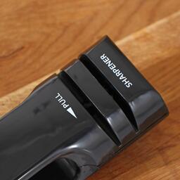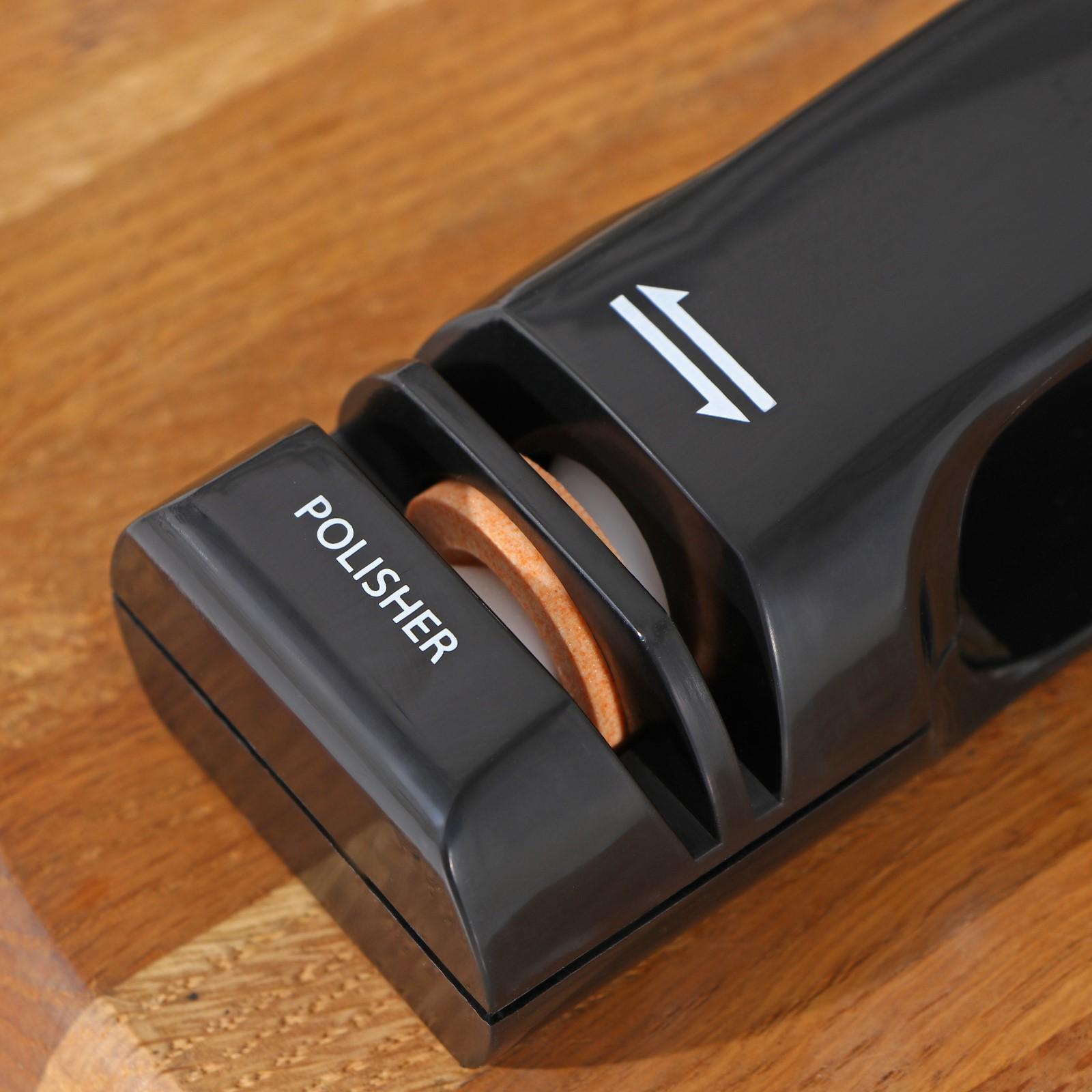 Вначале выполняется грубая заточка (sharpener), затем финишная полировка (polisher). На корпусе есть поясняющие надписи и стрелки, направляющие движения ножа.