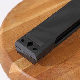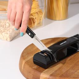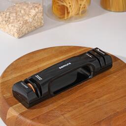 Двухфункциональное механическое приспособление используется для правки ножей с двухсторонней заточкой. Для каждого типа заточки предусмотрен свой паз.