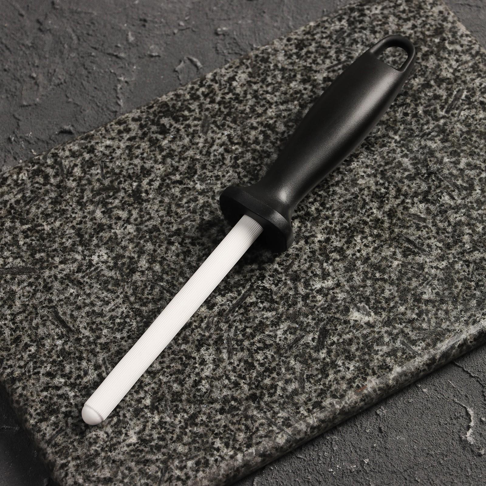 Мусат позволит быстро заточить лезвие по принципу «нож об нож». В результате оно станет идеально острым. Инструмент оснащён пластиковой ручкой.