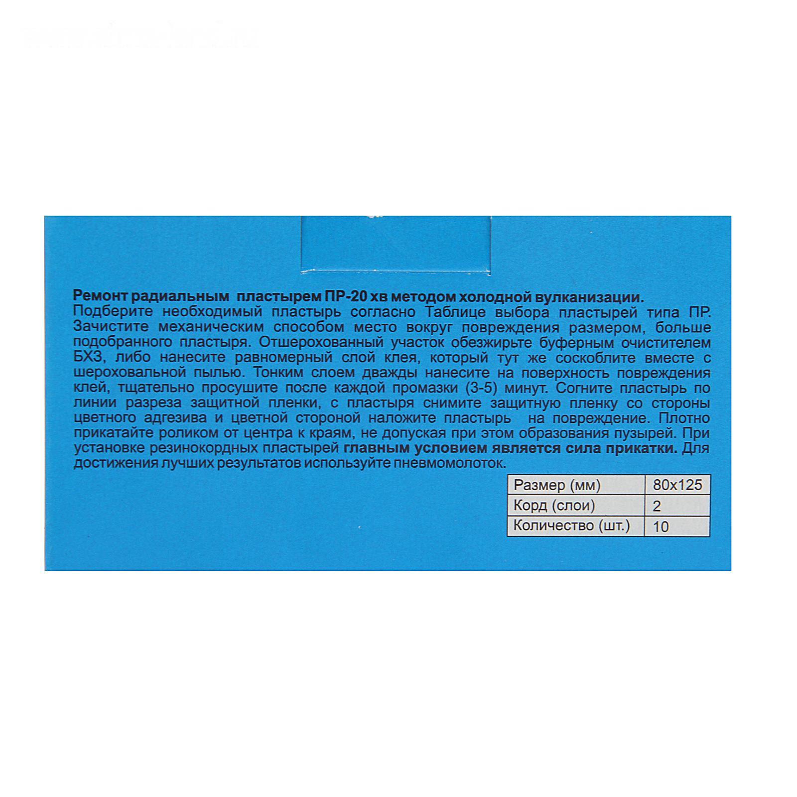 Пластырь резинокордный ПР-20 х.в, для радиальных шин, 80x125 мм, 2 слоя корда, набор 10 шт. 177825