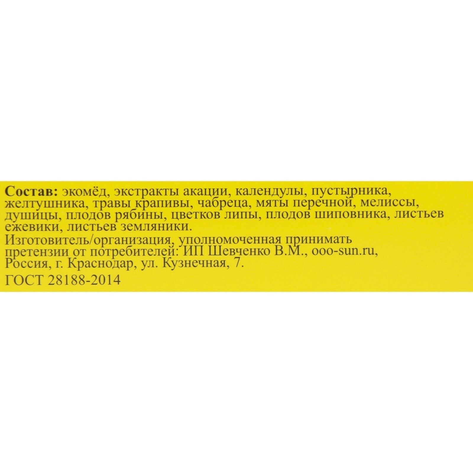 Состав: экомёд, травяные экстракты: акация, календула, пустырник, желтушник, трава крапивы, чабрец, мята перечная, мелисса, душица, плоды рябины, цветки липы, плоды шиповника, листья ежевики, листья земляники.