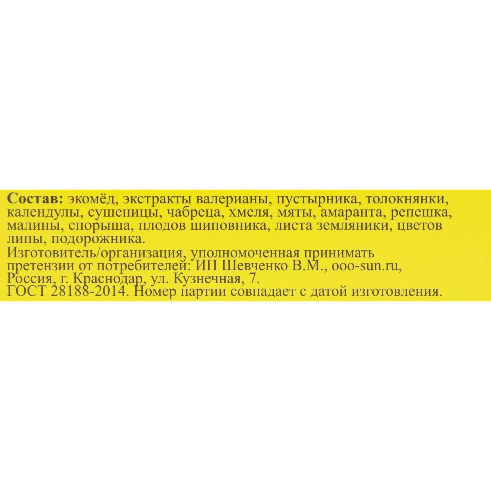 Состав: экомёд, экстракты травяные: валериана, пустырник, толокнянка, календула, сушеница, чабрец, хмель, мята, амарант, репешок, малина, спорыш, плоды шиповника, лист земляники, цветы липы, подорожник.