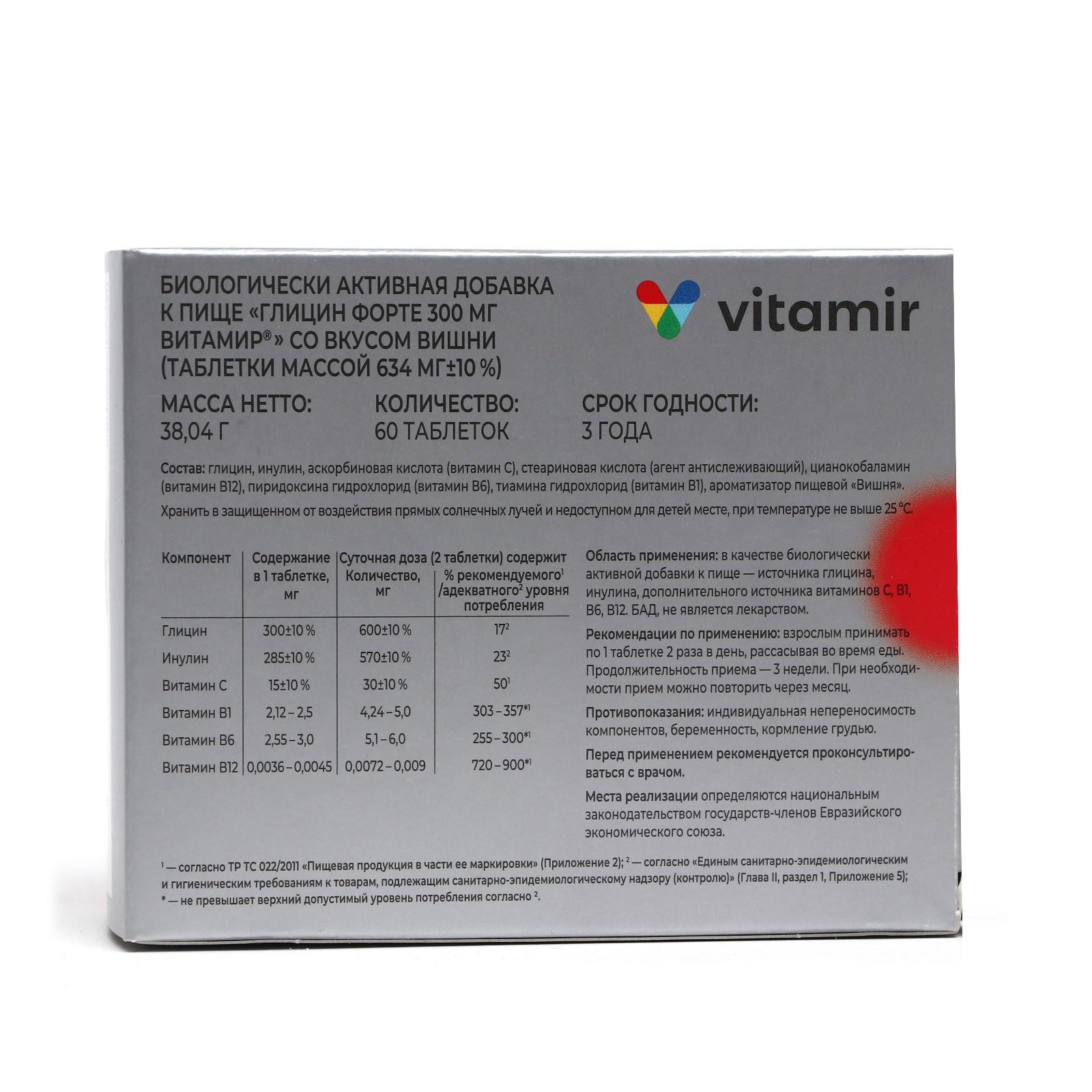 Глицин форте Витамир со вкусом вишни, 60 таблеток по 300 мг