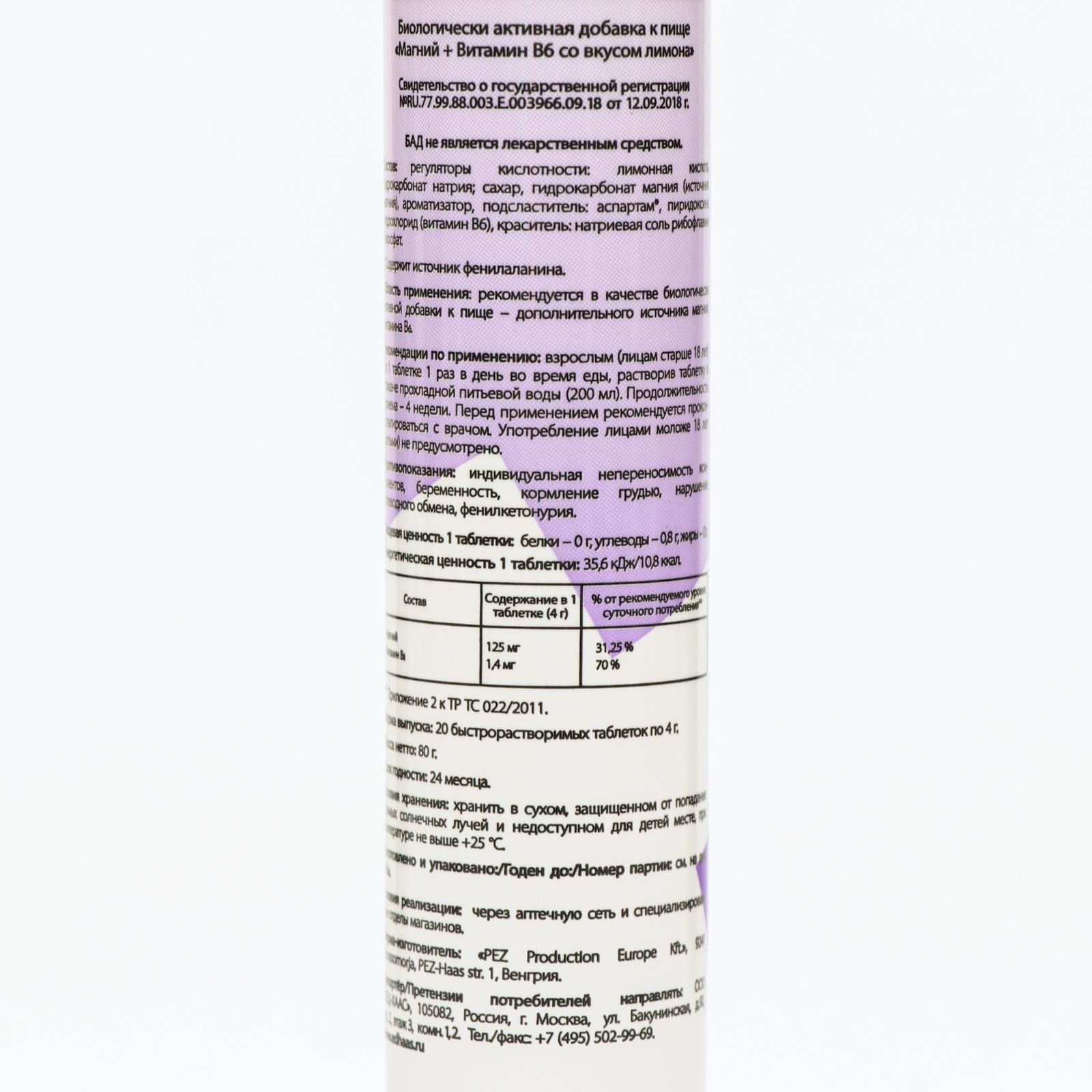 Состав: регуляторы кислотности: лимонная кислота, гидрокарбонат натрия; сахар, гидрокарбонат магния (источник магния), ароматизатор, подсластитель: аспартам*, пиридоксина гидрохлорид (витамин В6), краситель: натриевая соль рибофлавин 5-фосфат.