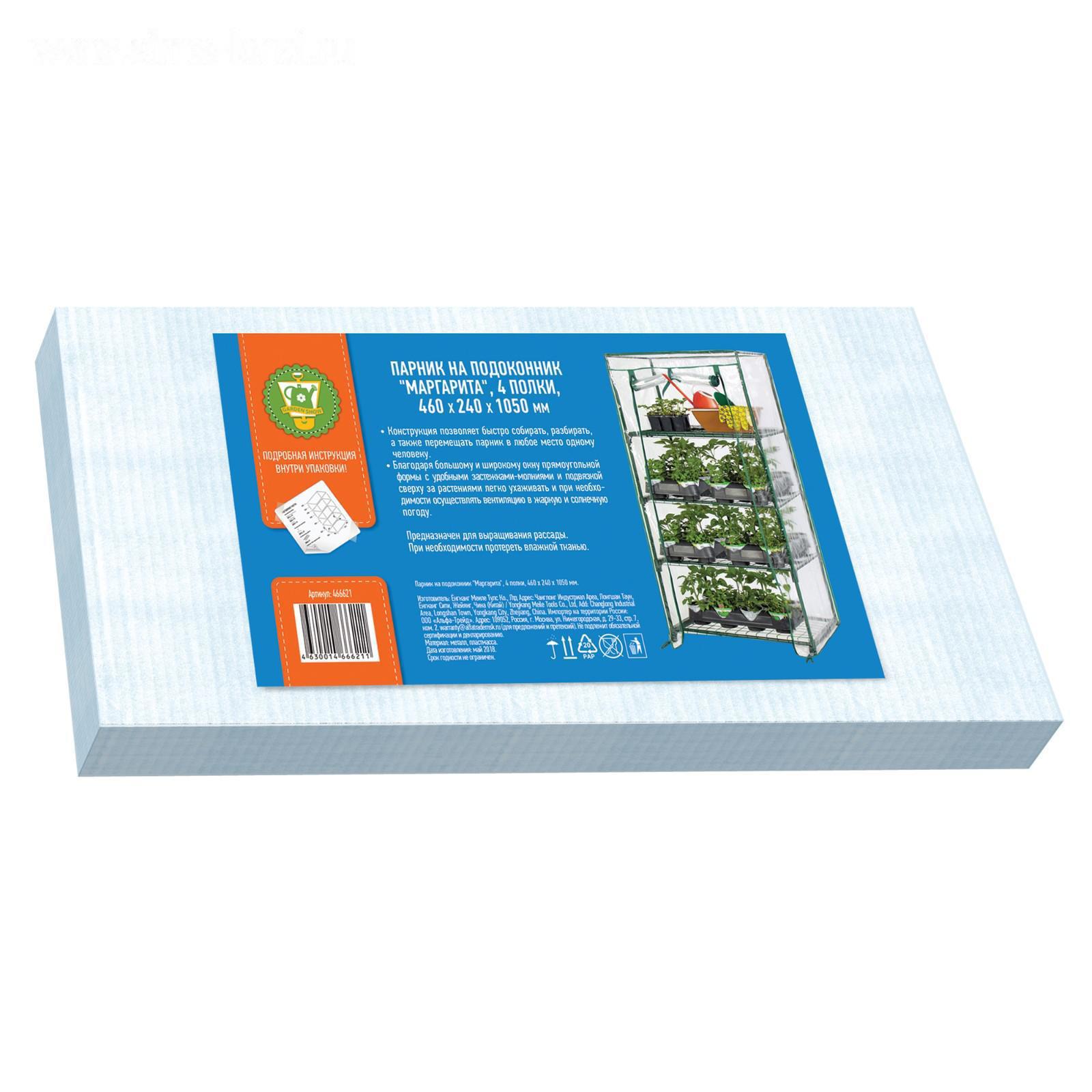 Парник «Маргарита» поможет организовать мини-огород на вашем подоконнике. На четырёх полках можно разместить зелень, рассаду, головки лука для проращивания зелёных перьев и многое другое. Хотите всю зиму есть свежий укроп и петрушку? Баловать родных необычными пряностями или вырастить на весну хорошую овощную рассаду? Тогда вам пригодится эта мини-теплица.