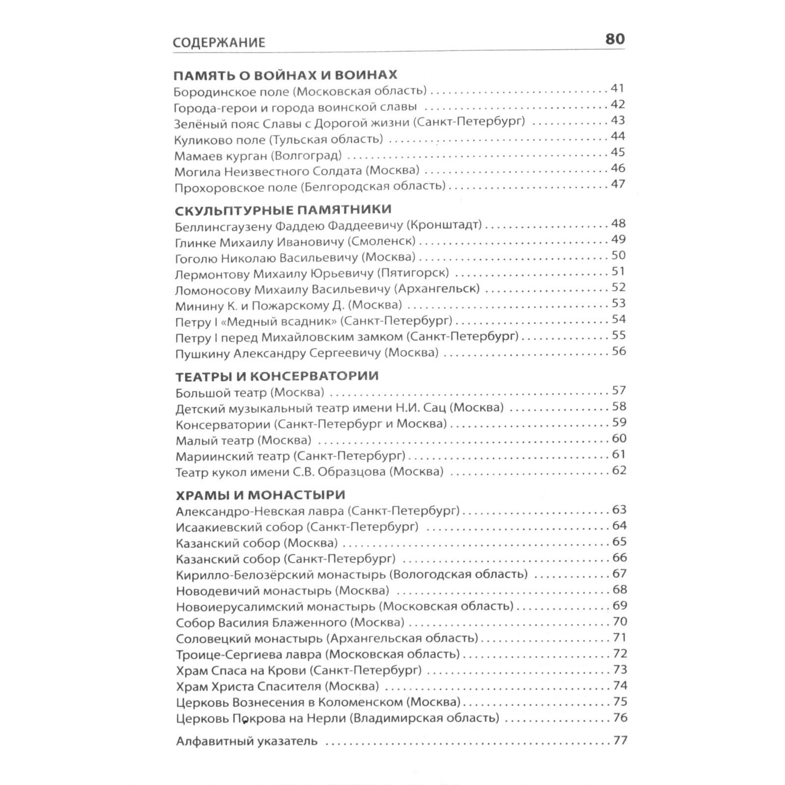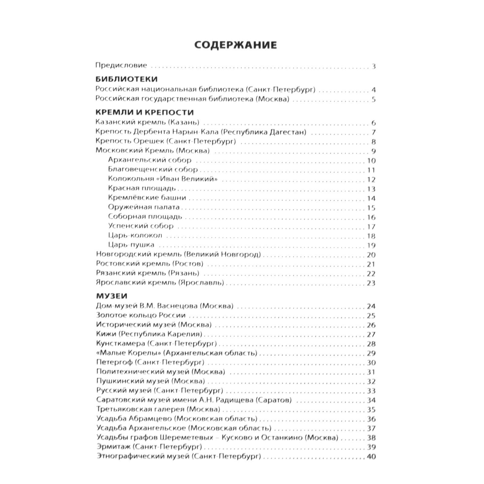 Издание знакомит младших школьников с интересными архитектурными памятниками России (крепостями, монастырями, храмами), историей из создания. Справочник содержит рассказы о скульптурных памятниках выдающимся правителям, поэтам, путешественникам, о крупнейших театрах, музеях и библиотеках. Адресовано учителям, родителям и учащимся 1-4 классов.