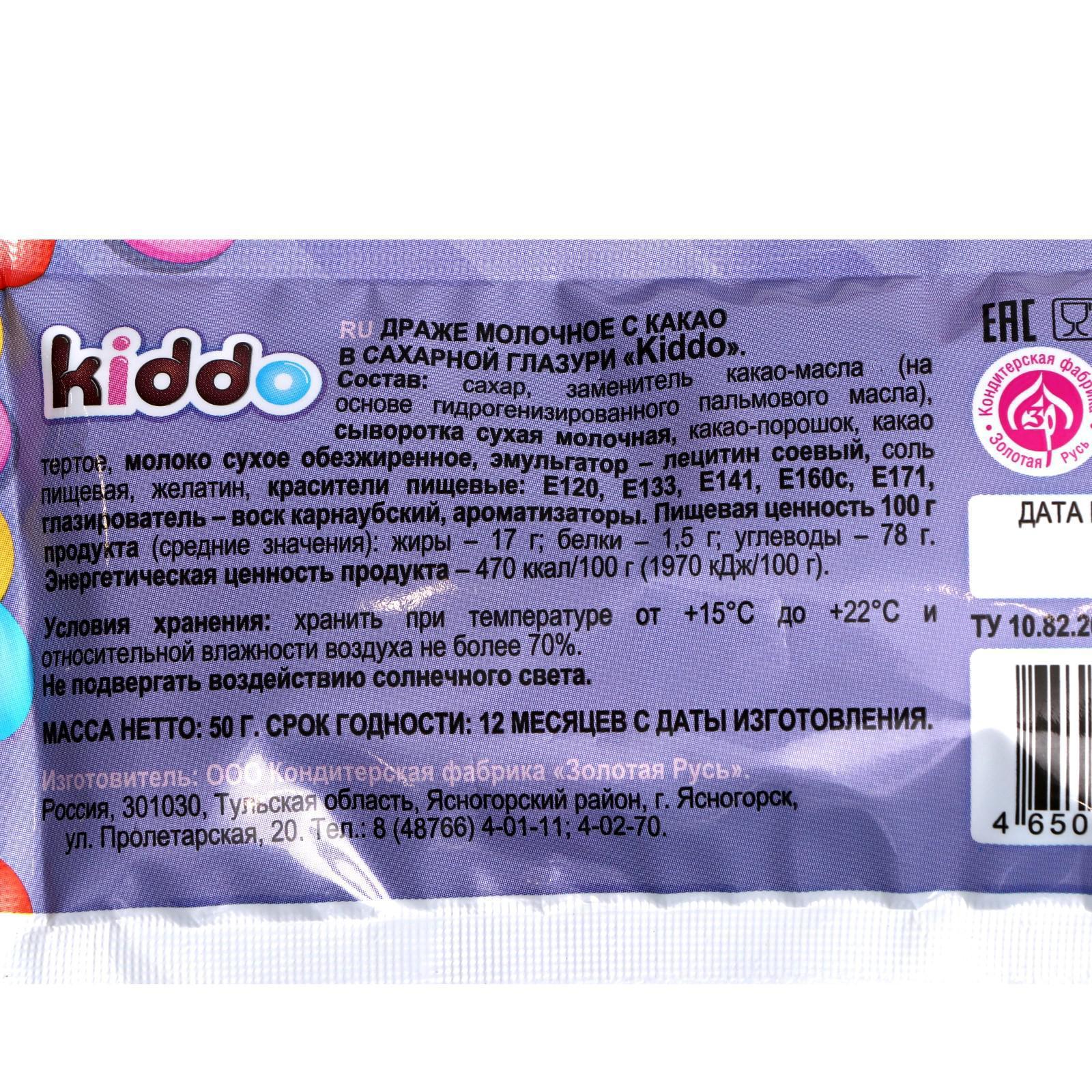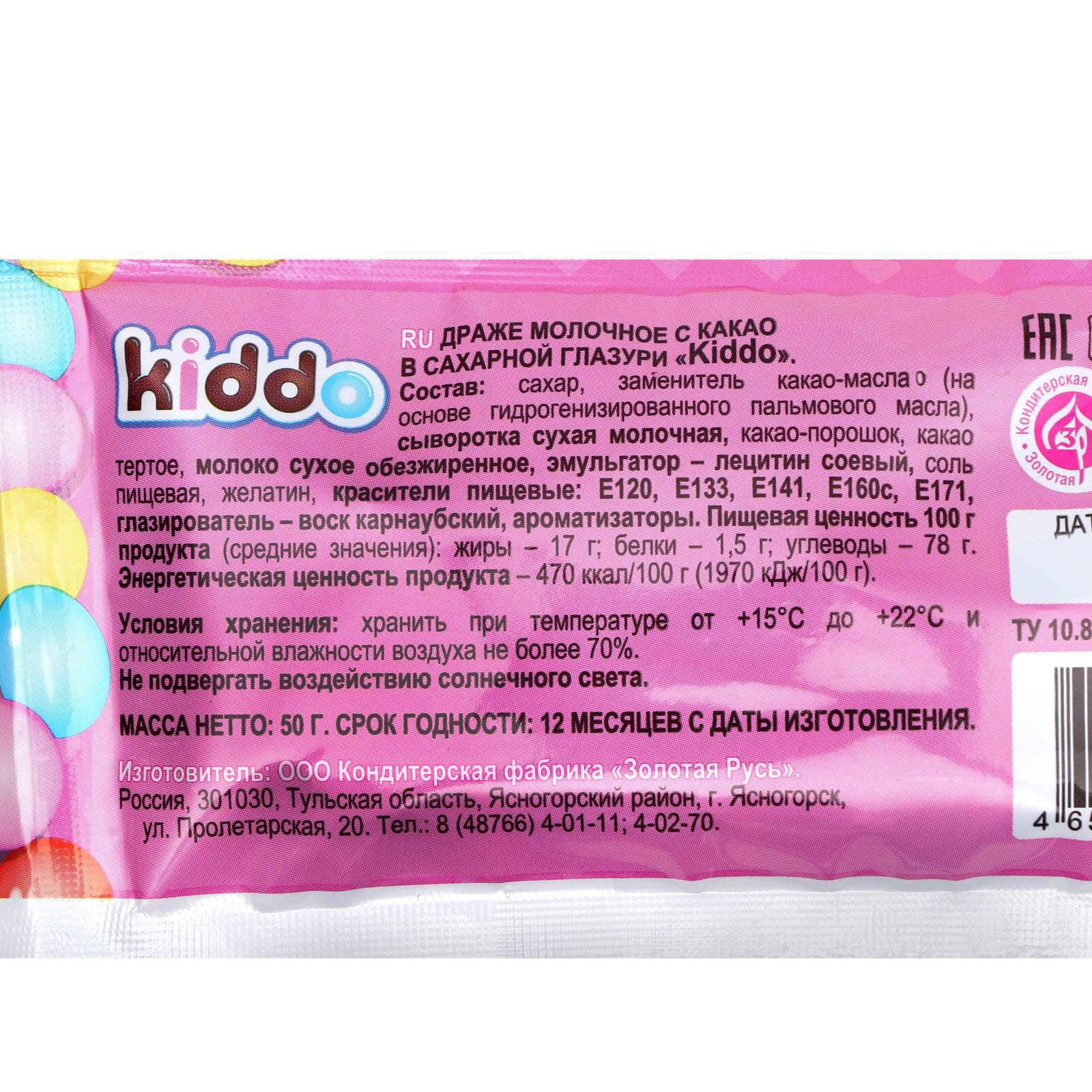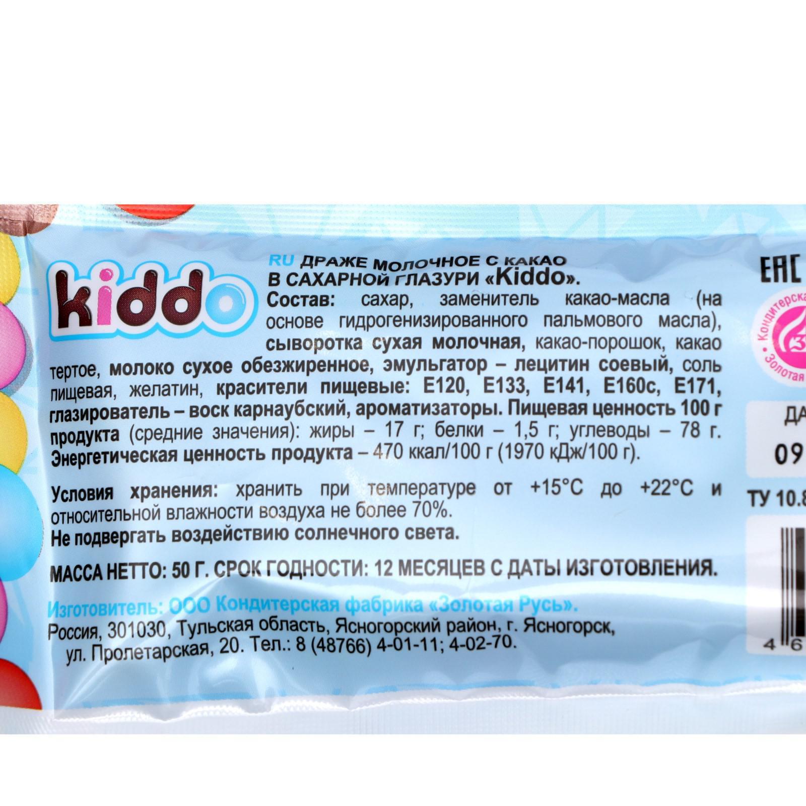 Драже "Kiddo" - пакетик разноцветного драже с какао с очень красочным дизайном. Отличный подарок для детей. Драже идеально подойдут для чаепития и на стол в любой праздник, а так же детям в качестве лакомства. И дети и взрослые просто обожают эти конфеты за мягкую консистенцию и разнообразный вкус!