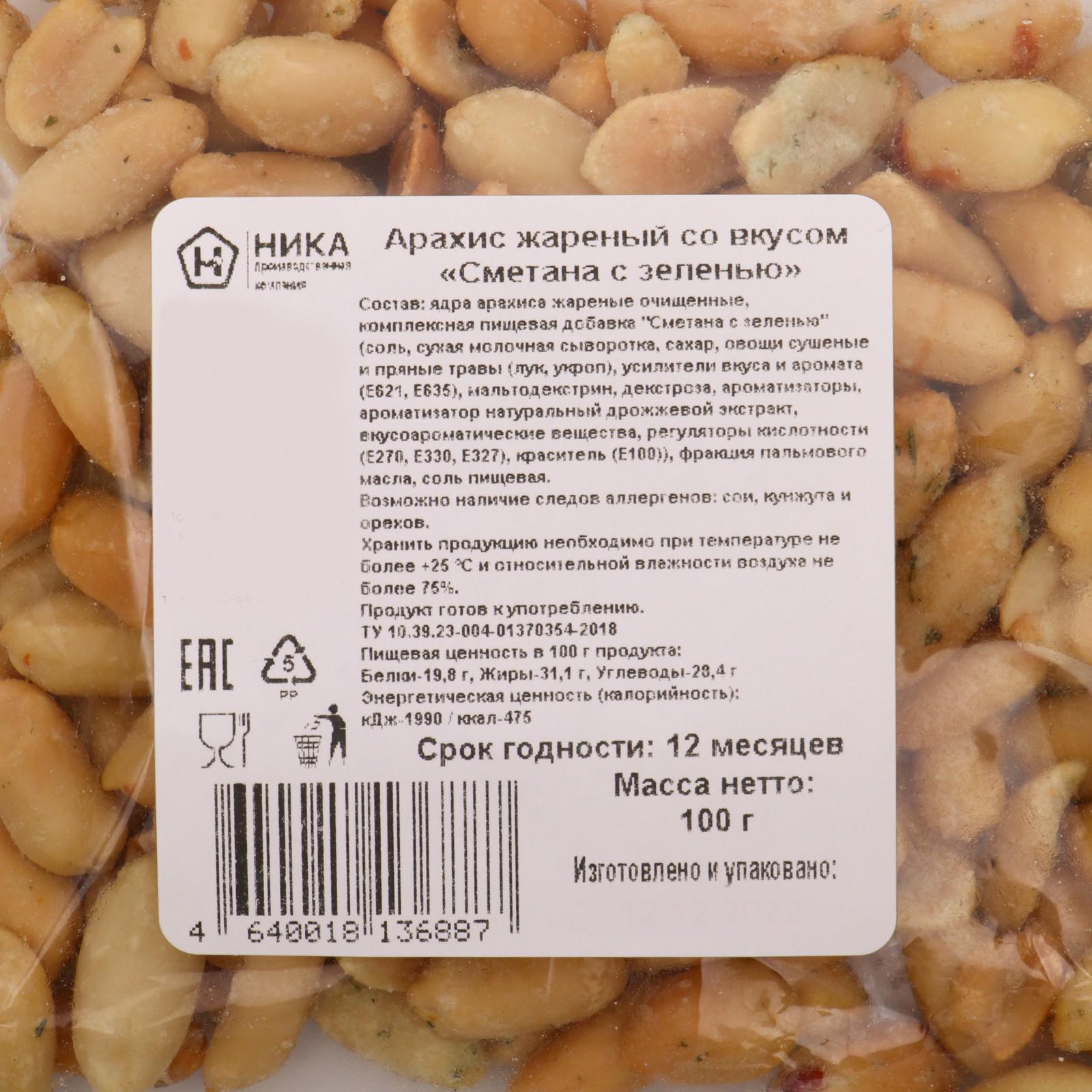 Арахис со вкусом "Сметана с зеленью" — сытный перекус в течение дня и хорошая закуска к пиву. Благодаря высокой калорийности быстро и надолго насыщает. Удобно брать с собой на работу, учёбу или в путешествие. Снек станет отличной альтернативой привычным сухарикам и чипсам. Внутри находится предварительно обжаренное отборное ядро арахиса. Орехи создают взрыв вкуса, который хочется прочувствовать снова и снова.