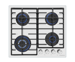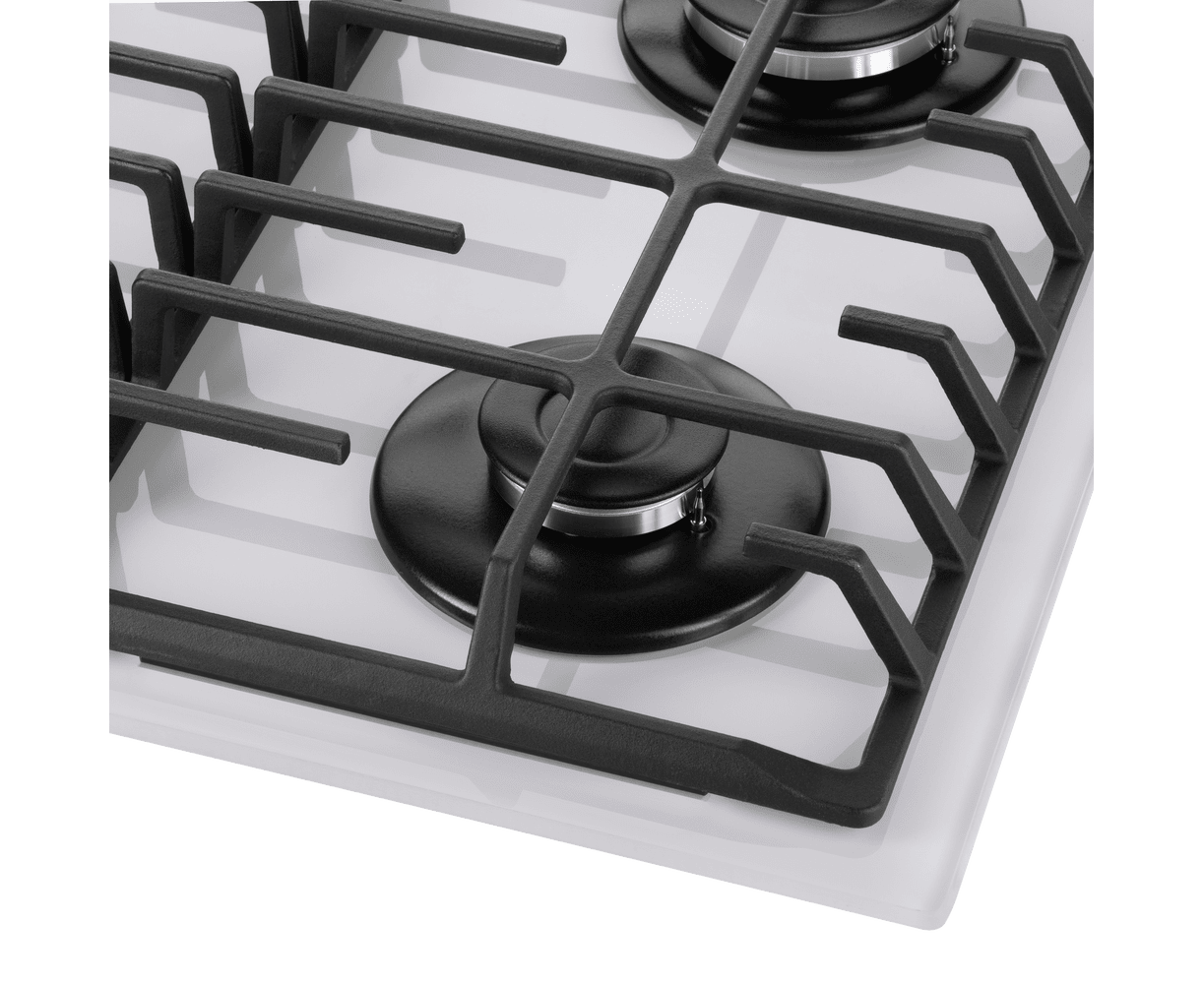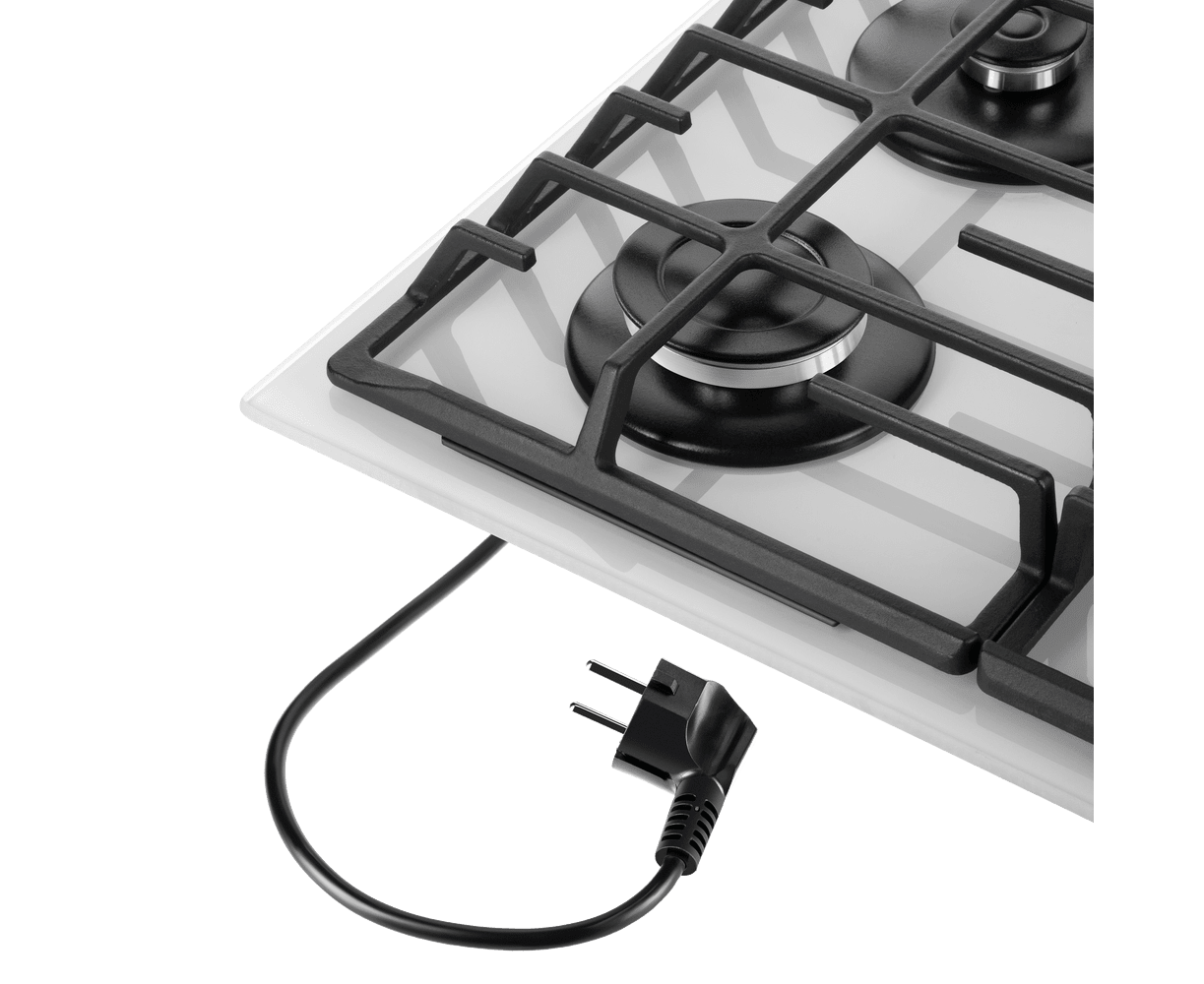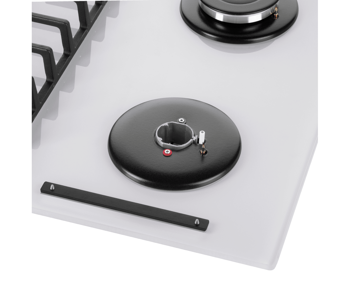 Панель выполнена из закаленного стекла белого цвета. В данной модели установлены высококачественные итальянские горелки SABAF (4 конфорки). Три стандартные конфорки мощностью 1700 Вт, 1700 Вт, 1000 Вт и одна WOK-конфорка с двойным пламенем мощностью 3800 Вт.