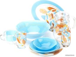 • Состав набора блюдо, кружка (6 шт.), кувшин (с крышкой), салатник (большой — 1 шт., малый — 6 шт.), стакан (6 шт.), тарелка закусочная (десертная) (6 шт.), тарелка столовая глубокая (6 шт.), чаша бульонная (6 шт.), тарелка столовая обеденная (6 шт.)