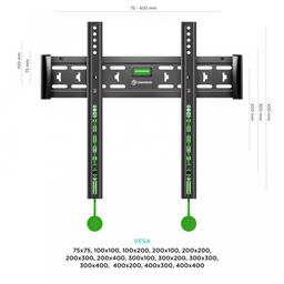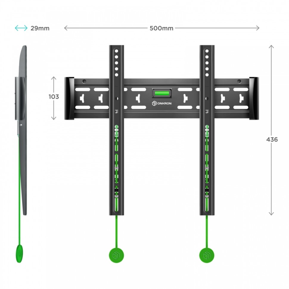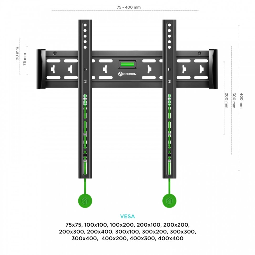 Настенный кронштейн ONKRON FM5 предназначен для телевизоров с диагональю от 32 до 65 дюймов. Максимальный выдерживаемый вес составляет 56,8 кг, что делает кронштейн подходящим для достаточно больших digital-панелей. Крепление универсально за счет множества предусмотренных производителем размеров VESA – от 75x75 мм до 400x400 мм. Широкий выбор вариантов монтажных отверстий для установки на стену позволяет надежно зафиксировать кронштейн даже при креплении к не самым прочным поверхностям. Изделие выполнено из холоднокатаной стали SPCC-класса, что означает его прочность и долговечность. Благодаря встроенному в корпус уровню Вы легко, ровно и быстро закрепите кронштейн на стене. Механизм защелок на направляющих позволяет легко снять ТВ, лишь потянув за специальные фиксаторы – это преимущество позволит сэкономить время и силы. Расстояние от стены составляет 29 мм, что придает кронштейну компактный и аккуратный внешний вид, делая его почти незаметным за Вашей ТВ-панелью. Кронштейн подходит для большинства телевизоров популярных брендов, среди которых Samsung, LG, Sony, KIVI, Tcl, Xiaomi Mi, SUPRA, Panasonic, Hyundai, Erisson, Asano, Horizont, JVC, Thomson, HARTENS, Sharp, Toshiba, Skyworth, BBK, AVEL, Витязь, Веко, BQ, DEXP, SkyLine, Pioneer, Rolsen, Harper, Hisense, Hitachi, Polarline, Prestigio, Telefunken и других.
