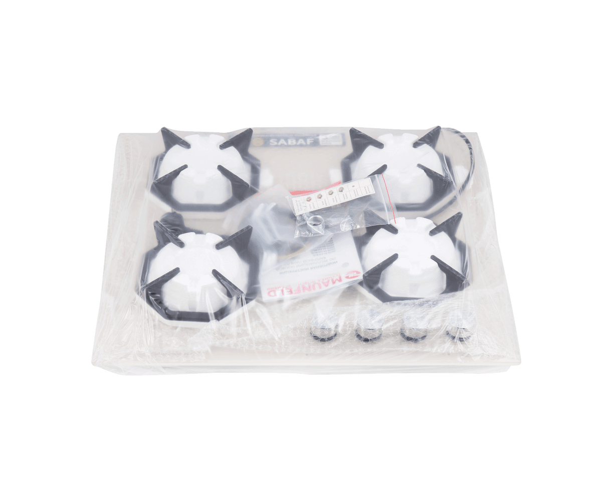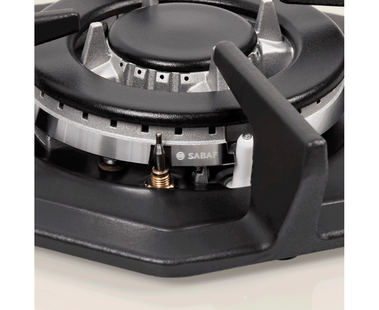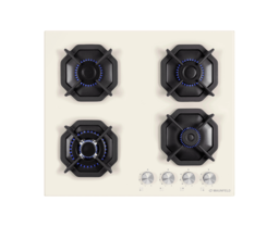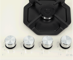 Панель выполнена из закаленного стекла белого цвета. В данной модели установлены высококачественные итальянские горелки «Sabaf» (4 конфорки). Три стандартные конфорки мощностью 1000 Вт, 1700 Вт, 1700 Вт и одна мощная WOK-конфорка с двойным пламенем мощностью 3000 Вт.