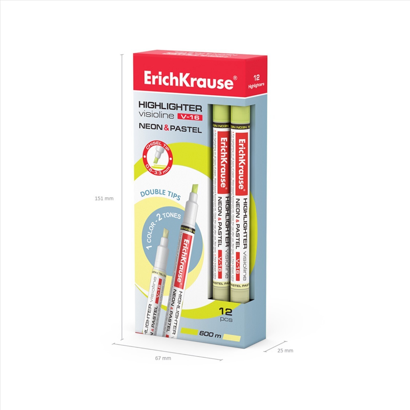Маркер текстовыделитель ErichKrause Visioline V-16 Neon+Pastel, 0.6-3.3 мм, двусторонний, чернила на водной основе, жёлтый
