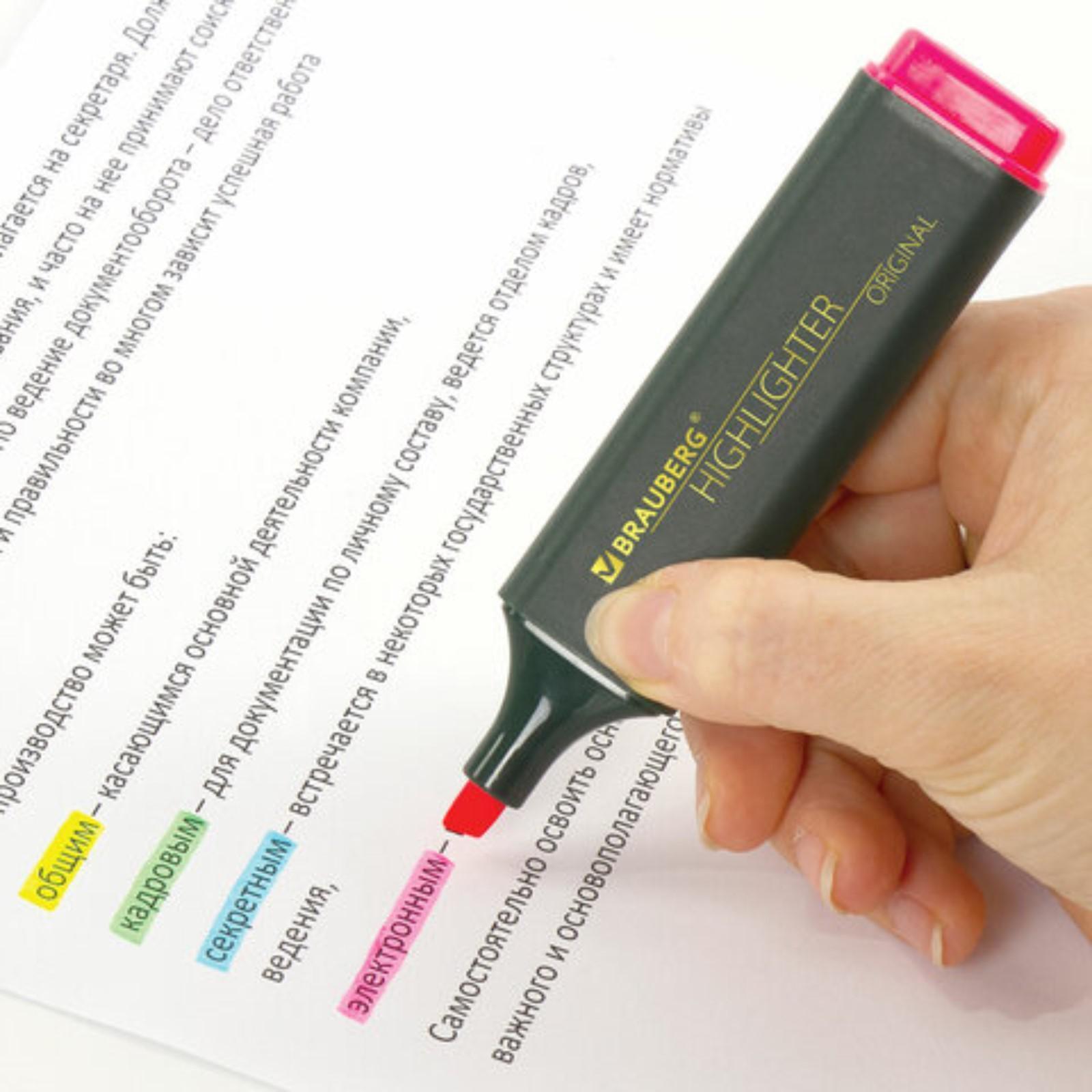Текстовыделители BRAUBERG "ORIGINAL" предназначены для выделения текста на бумаге любого типа, включая факс-бумагу. В наборе четыре неоновых цвета: желтый, зеленый, розовый, голубой. Плоская форма корпуса, диаметр которого 25 мм. Скошенный наконечник имеет толщину линии письма от 1 до 5 мм, что обеспечивает удобство при работе с текстом, напечатанным мелким шрифтом, или таблицами. Благодаря особой водной основе чернил текстовыделители не высыхают без колпачка в течение 8 часов. Текстовыделители обладают экономным расходом чернил, при этом длина линии письма достигает 300 метров. Чернила быстро впитываются и тем самым предотвращают размазывание в процессе использования. Светоустойчивые чернила не выцветают даже на открытом солнце. Цвет клипа соответствует цвету чернил.