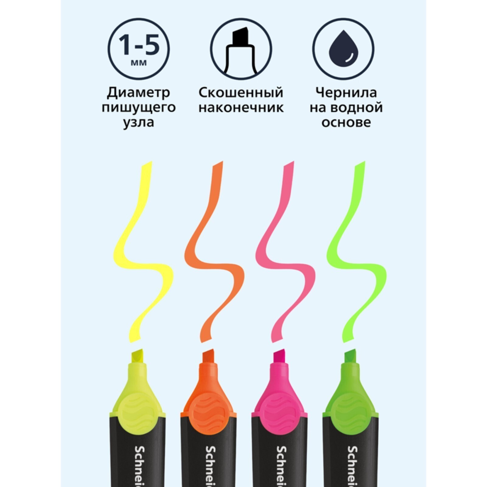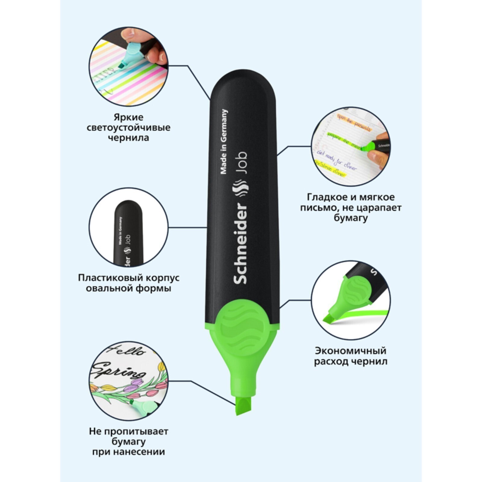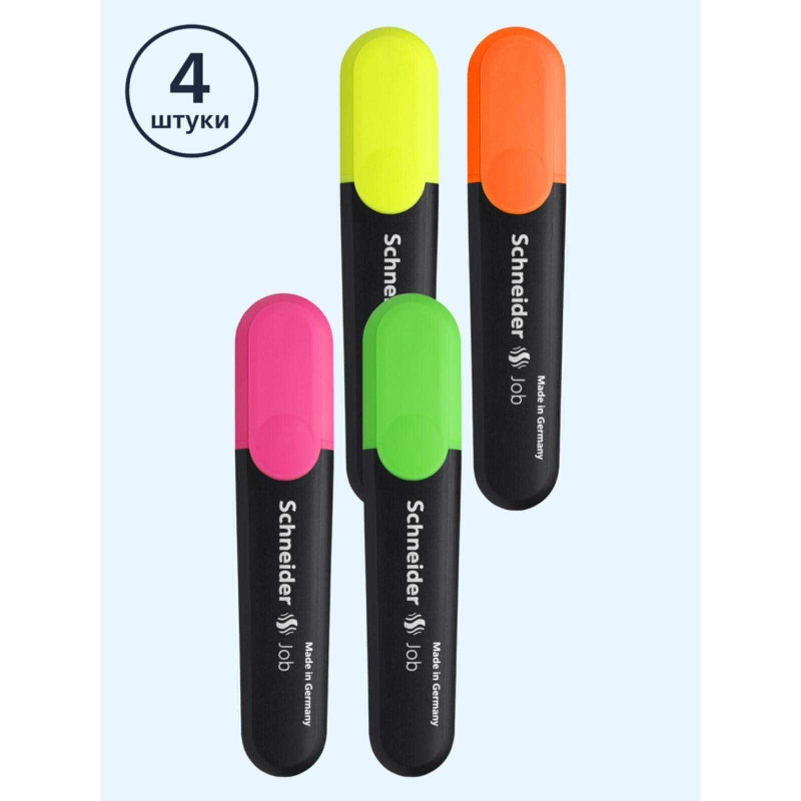 Универсальные текстовыделители Schneider Job имеют светостойкие чернила яркого неонового цвета на водной основе. В наборе 4 цвета: жёлтый, зелёный, оранжевый, розовый. Schneider Job подходит для различных типов бумаги. Текстовыделители представлены со скошенным наконечником. Цвет колпачка и элементов корпуса соответствует цвету чернил.