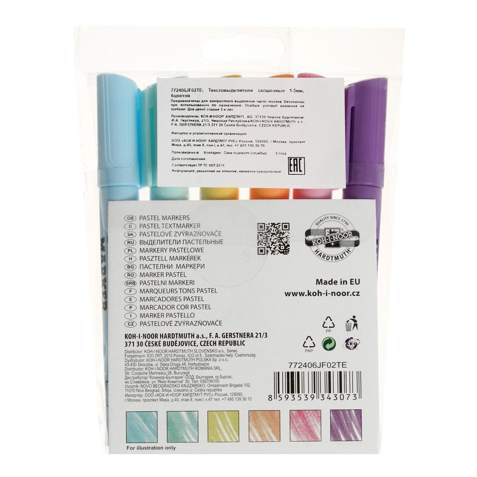 Набор маркеров текстовыделителей 6 цвета Koh-I-Noor 2406, 1-5 мм, скошен, пастельные, блистер