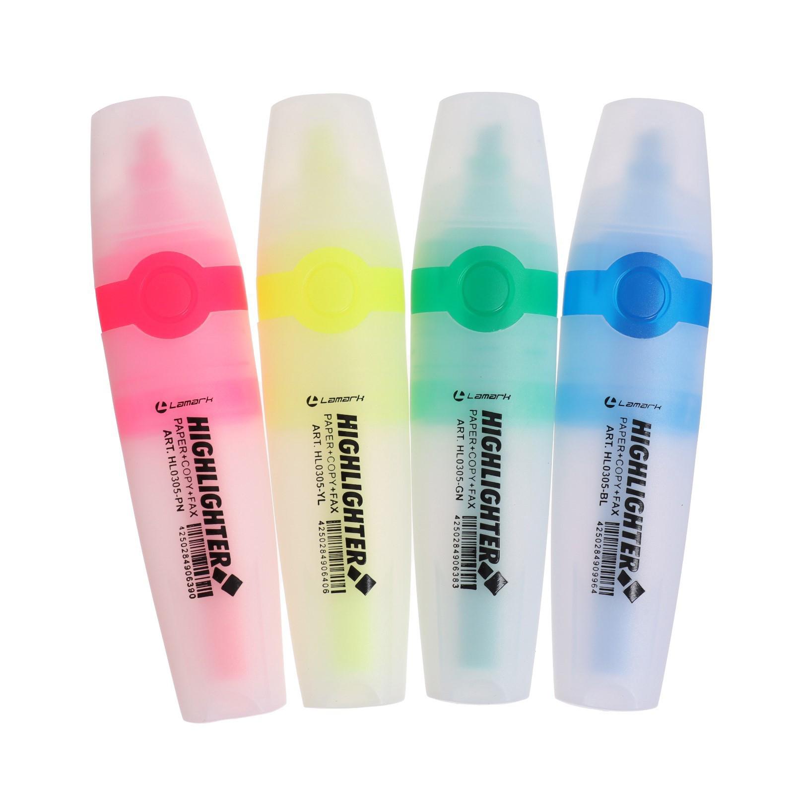 Набор маркеров-текстовыделителей Lamark состоит из четырех цветов маркеров: желтый, розовый, зеленый, синий. Маркеры предназначены для выделения текста на разных типах бумаг. Светоустойчивые быстросохнущие чернила не токсичны, без запаха. Толщина линии 1-5 мм. Клиновидный наконечник. Упакованы в прозрачный пакет с европодвесом.