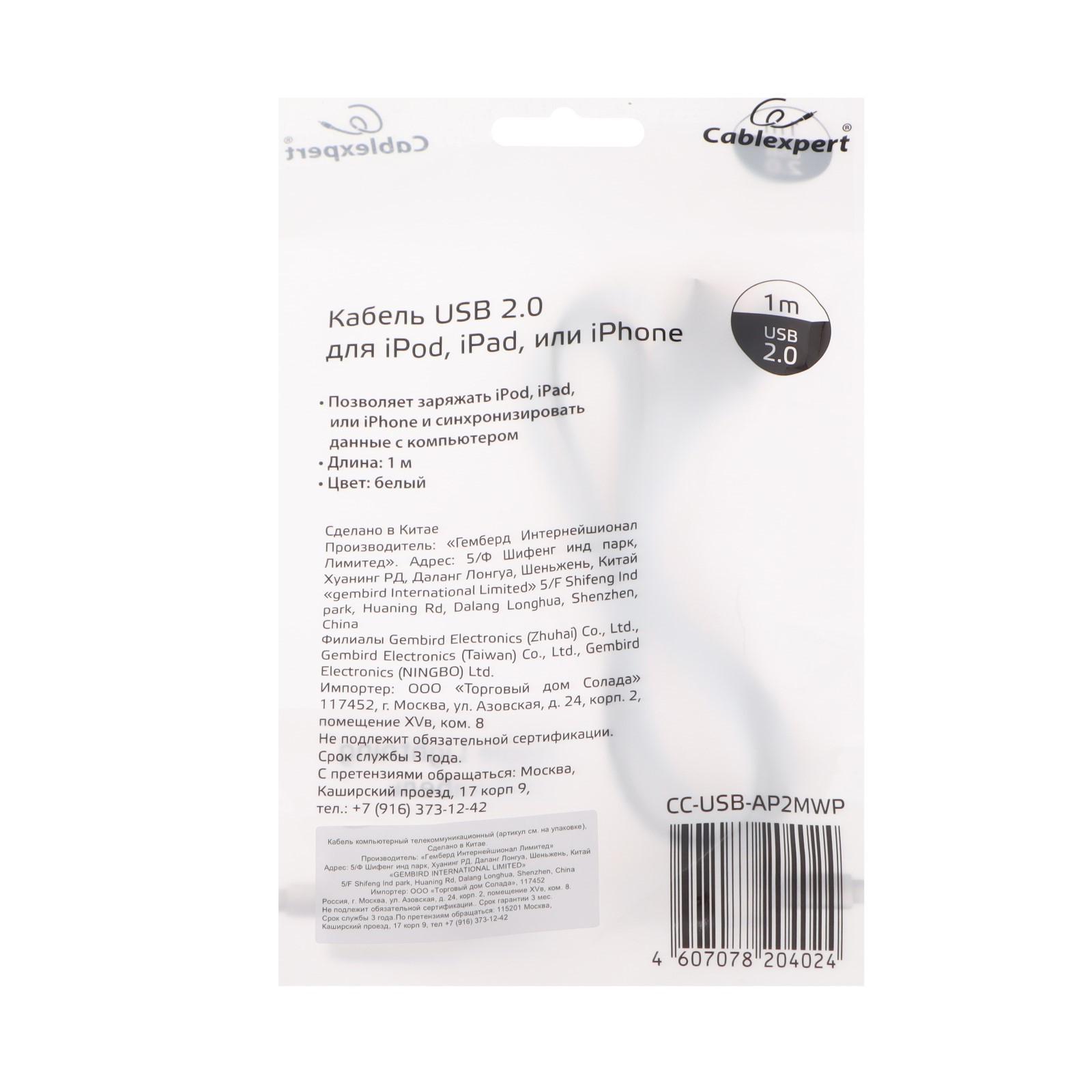 Кабель Cablexpert CC-USB-AP2MWP, Lightning - USB, 1 м, белый