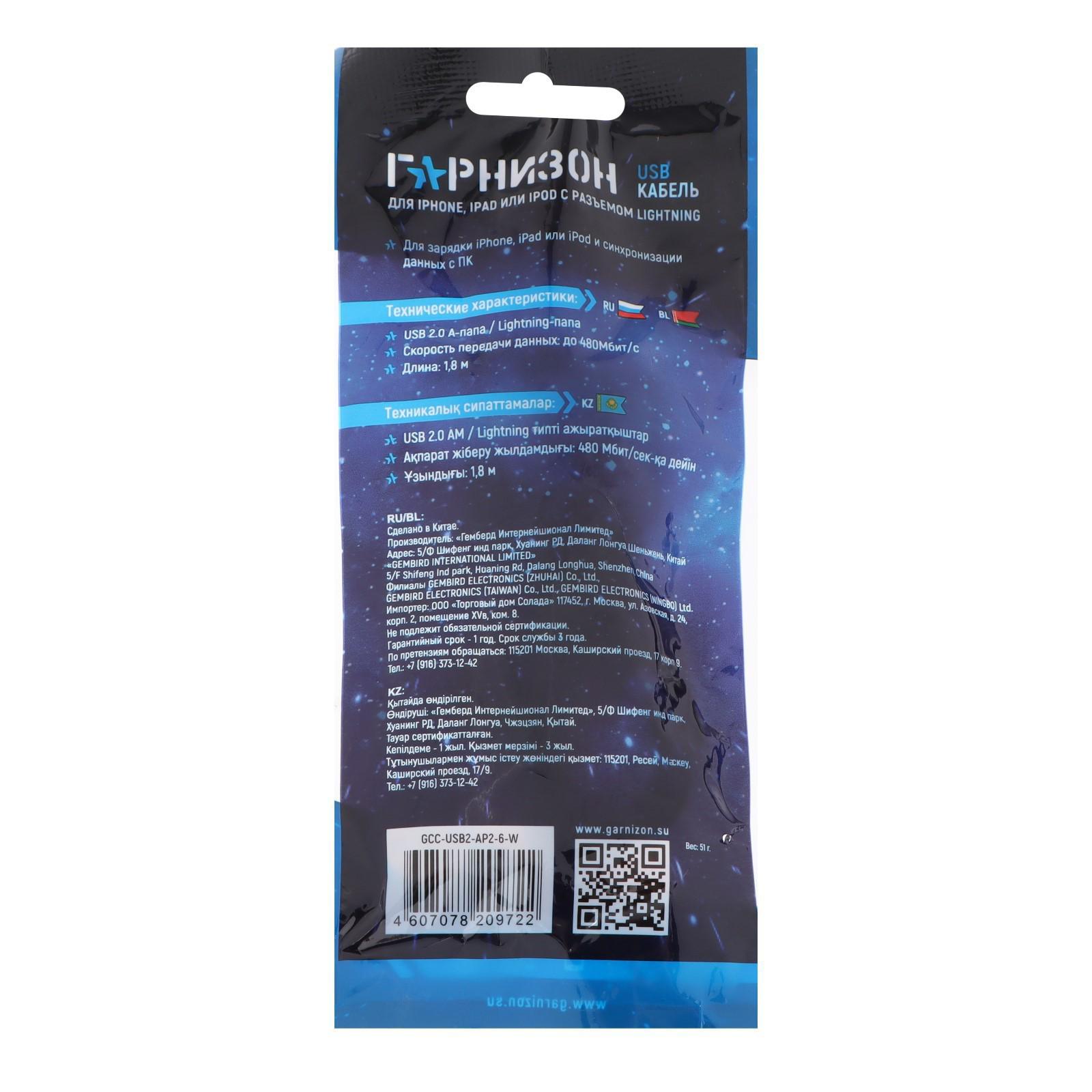 Кабель Гарнизон GCC-USB2-AP2-6-W, Lightning - USB, 1.8 м, белый