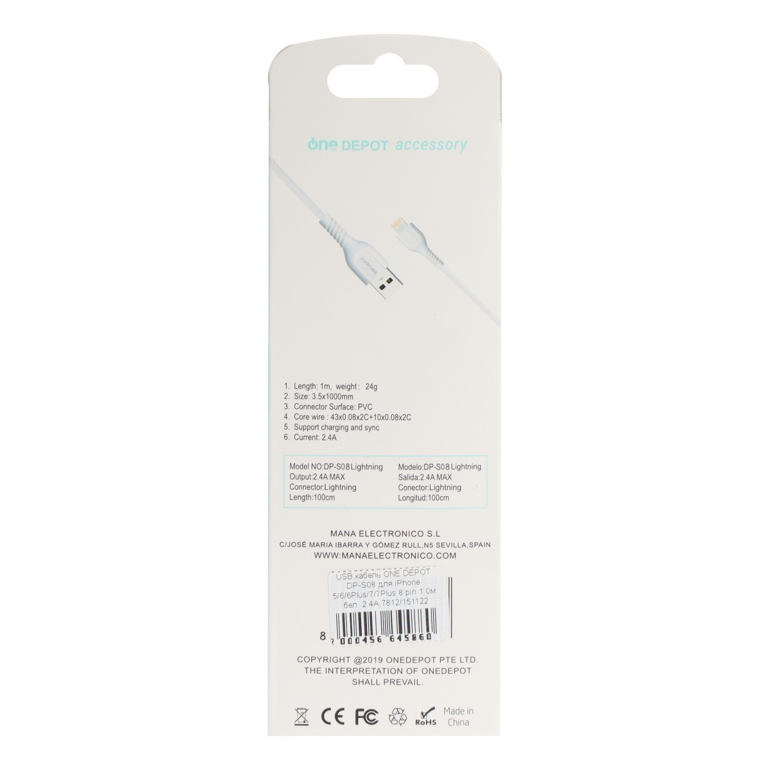 Кабель ONE DEPOT DP-S08, Lightning - USB, 2.4 А, 1 метр, белый