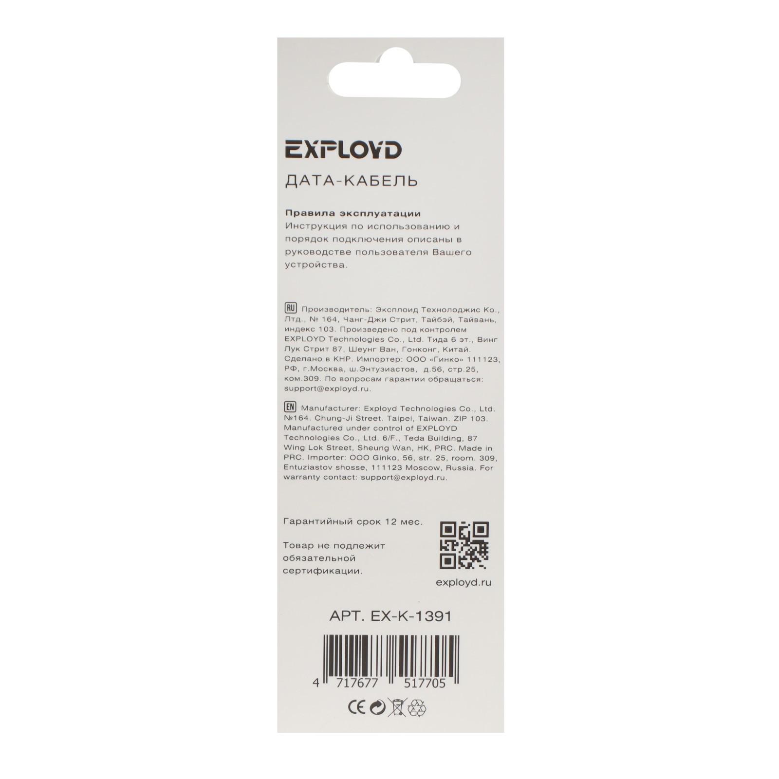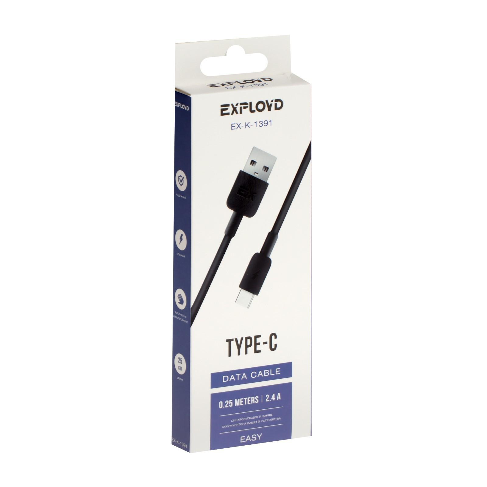 Кабель Exployd EX-K-1391, Type-C - USB, 2.4 А, 0.25 м, силиконовая оплетка, черный