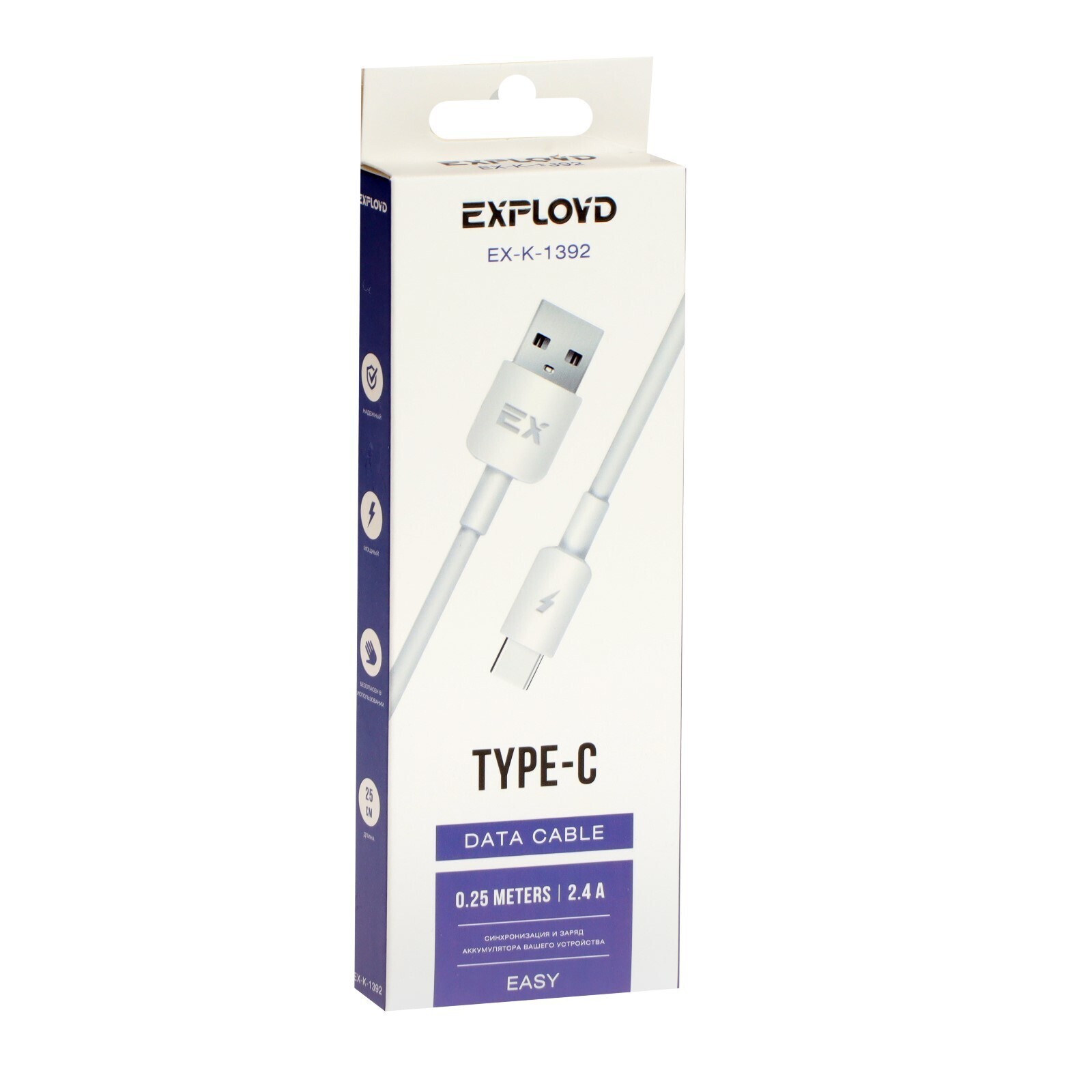 Кабель Exployd EX-K-1392, Type-C - USB, 2.4 А, 0.25 м, силиконовая оплетка, белый