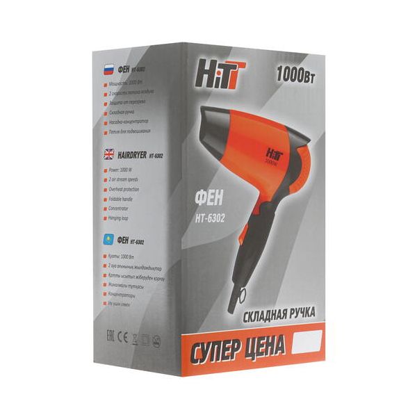 Фен Hitt HT-6302 представляет собой невероятно компактное устройство со складной ручкой, которое вы сможете взять с собой в любую поездку. В нем реализовано 2 температурных и 2 скоростных режима, переключение которых осуществляется при помощи кнопки на корпусе. Еще одно достоинство модели Hitt HT-6302 – предусмотренная в комплекте насадка-концентратор, при помощи которой вам не составит труда создать видимый прикорневой объем. Этот фен не займет много места даже в маленькой ванной комнате, поскольку в нем предусмотрена прочная петля для подвешивания, обеспечивающая его компактное хранение.
