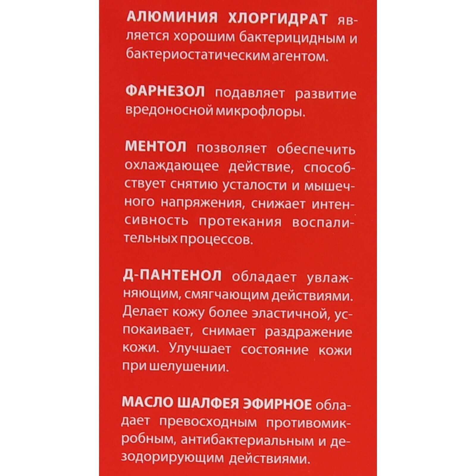 Состав: натуральные минералы для снижения потоотделения, эфирные масла чайного дерева и лаванды, д-пантенол, витамин Е, экстракт винограда.