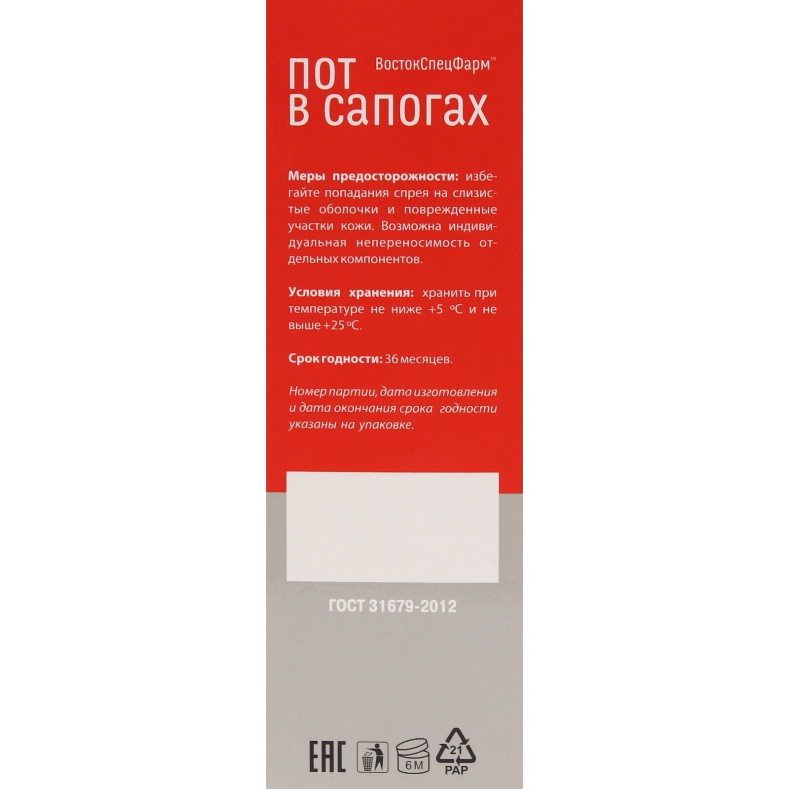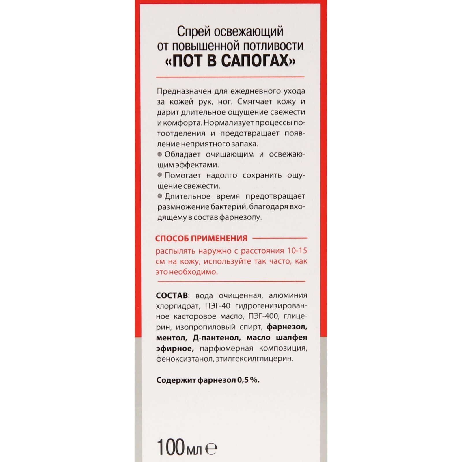 Спрей «Пот в сапогах» от повышенной потливости — профессиональное средство для эффективной защиты кожи ног и рук от чрезмерного потоотделения и неприятного запаха. Дезодорирует и ухаживает за кожей при длительном нахождении в закрытой обуви, перчатках. Эффективная профилактика грибковых инфекций. Обладает охлаждающим действием.