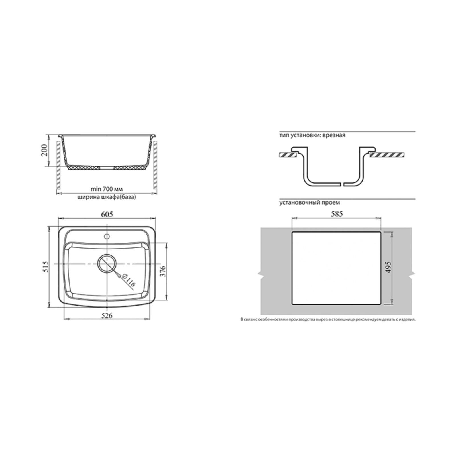 Мойка кухонная из камня GranFest GF-S605, 605х515 мм, цвет иней