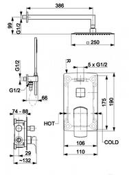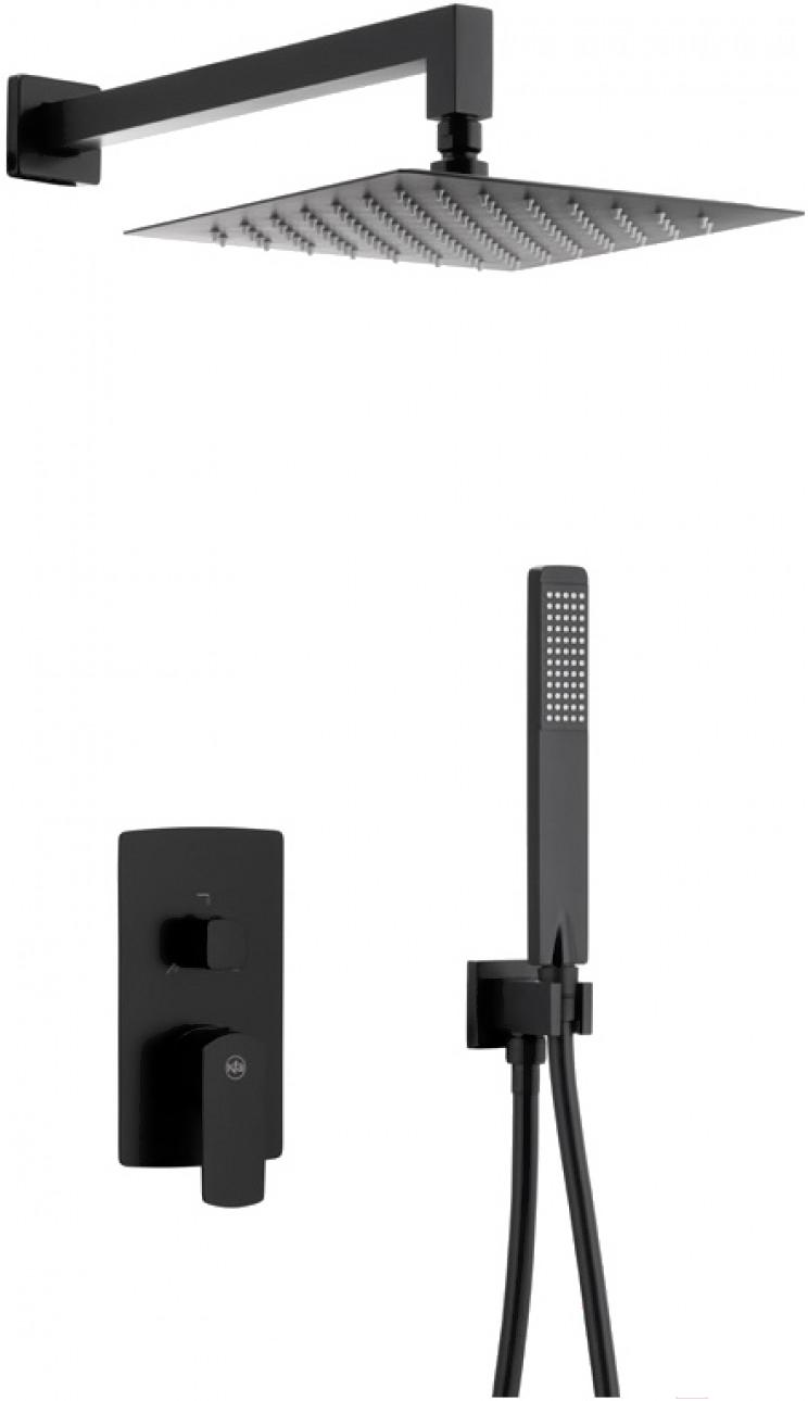 - В комплекте верхний душ, держатель, штанга, смеситель, душевой шланг, лейка ручная, крепления, розетка, заглушка