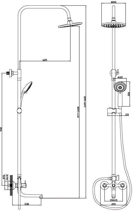 - В комплекте верхний душ, держатель, штанга, смеситель (с коротким изливом), душевой шланг, лейка ручная, крепления